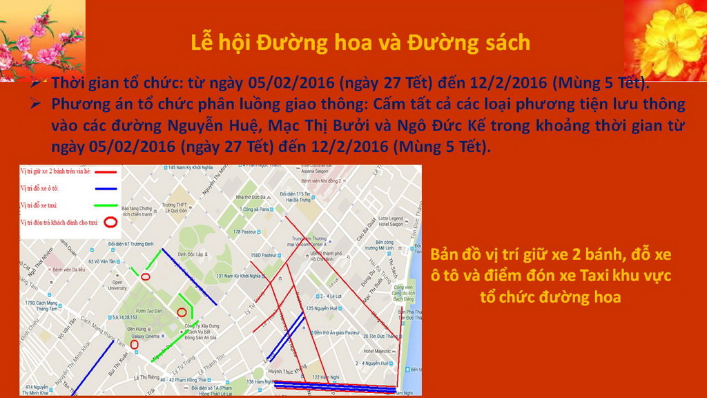 Danh sách các tuyến đường, khu vực đậu xe phục vụ lễ hội khu vực trung tâm (vỉa hè dành đậu xe máy, lòng đường đậu xe ô tô).