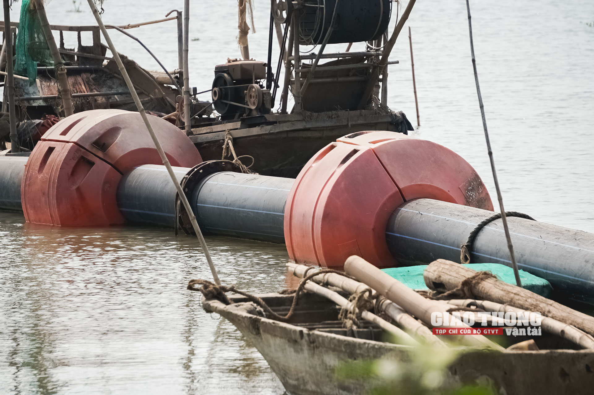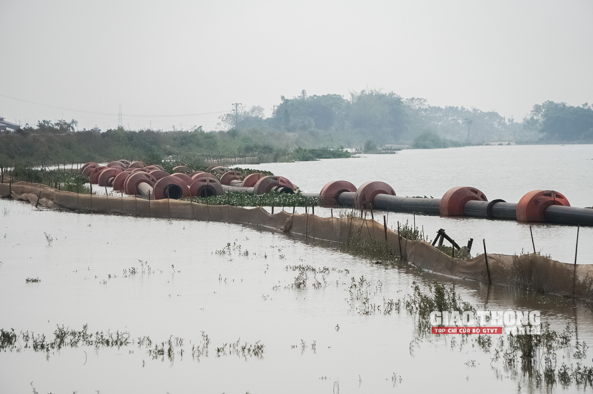 Ở hai phía đầu kênh nối với sông Đáy và Ninh Cơ cũng được nạo vét để đảm bảo đồng bộ về chiều rộng, chiều sâu của tuyến kênh. Trong ảnh: Hệ thống đường ống phục vụ công tác nạo vét