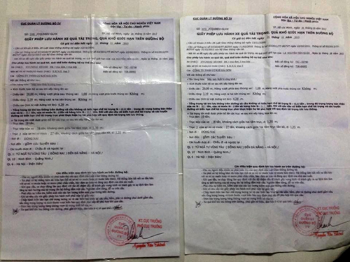 | Hai giấy phép lưu hành quá tải trọng, quá khổ giới hạn trên đường bộ mà xe 73C-027.40/73R-000.92 cung cấp cho lực lượng chức năng. |