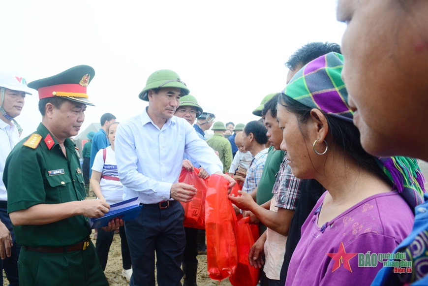 Đại diện lãnh đạo chính quyền tỉnh Lào Cai, các nhà hảo tâm và Binh đoàn 12 tặng quà nhân dân thôn Nậm Tông.