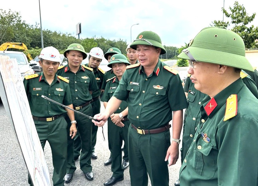 Thiếu tướng Nguyễn Hữu Ngọc (đứng giữa), Tư lệnh Binh đoàn 12, Tổng Giám đốc Tổng công ty xây dựng Trường Sơn đi kiểm tra tiến độ thi công trên công trường một dự án cao tốc