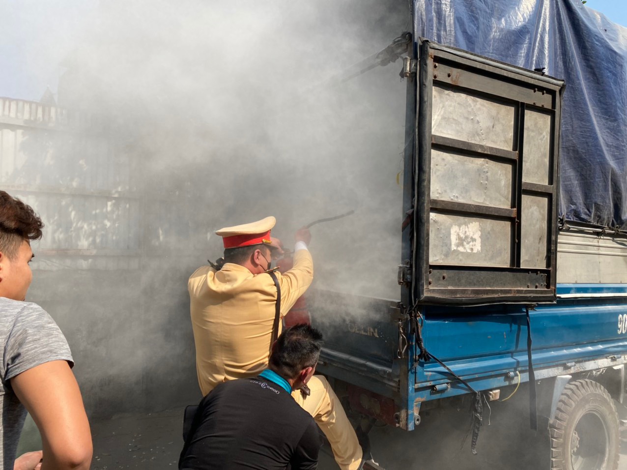 Đồng thời, các chiến sĩ CSGT đã lao vào thùng xe mang nhiều hàng hoá, nhanh chóng di chuyển nhiều phương tiện ở đó tránh đám cháy lan sang nhiều xe ô tô gần đó. Nhờ nỗ lực dùng nhiều bình chữa cháy cầm tay, sau khoảng 15 phút, đám cháy được khống chế hoàn toàn.