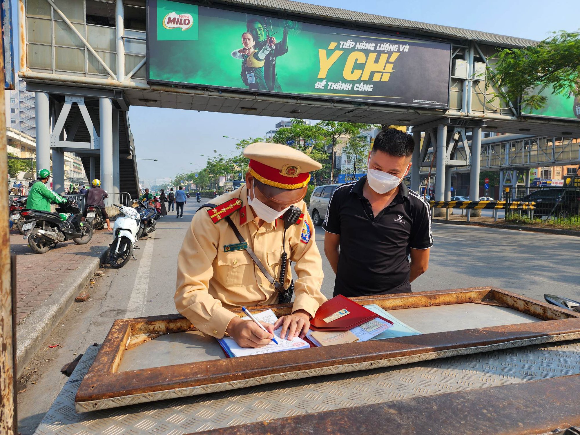 Ngay tại chốt xử lý, tài xế Vũ Minh Đ. phân trần, thường xuyên chở khách đến Bệnh viện Bạch Mai, vừa đỗ lại đây với mong muốn xem có khách để chở thì bị CSGT xử lý.