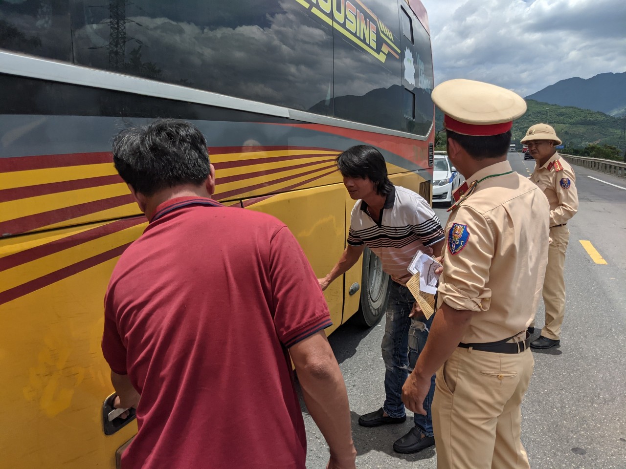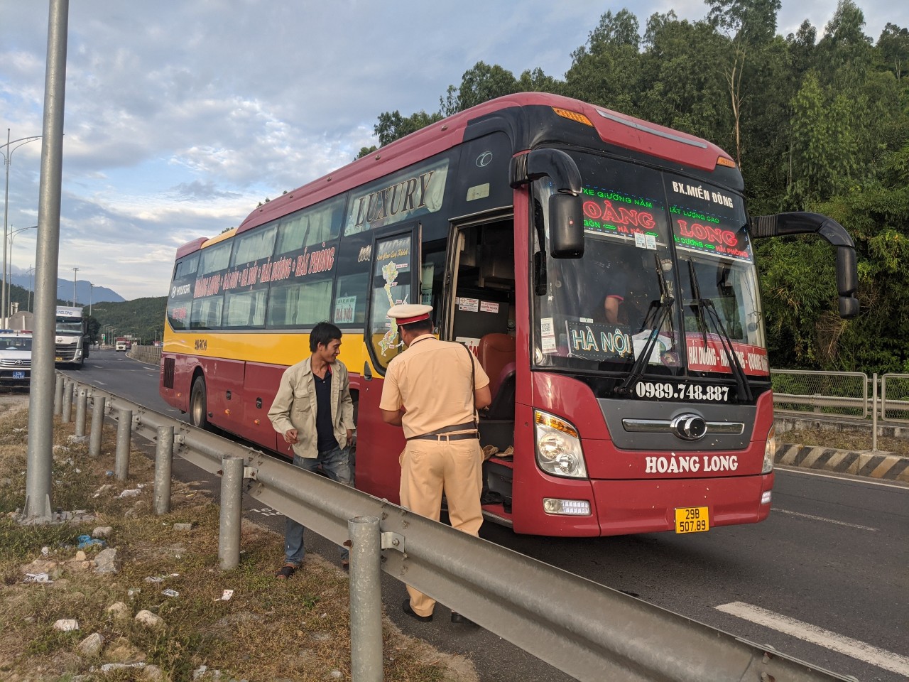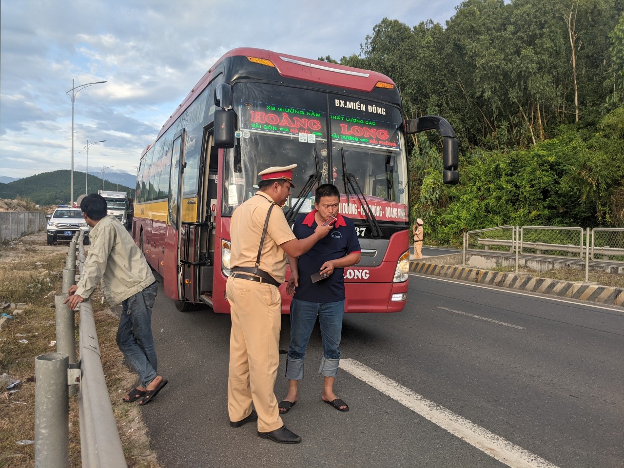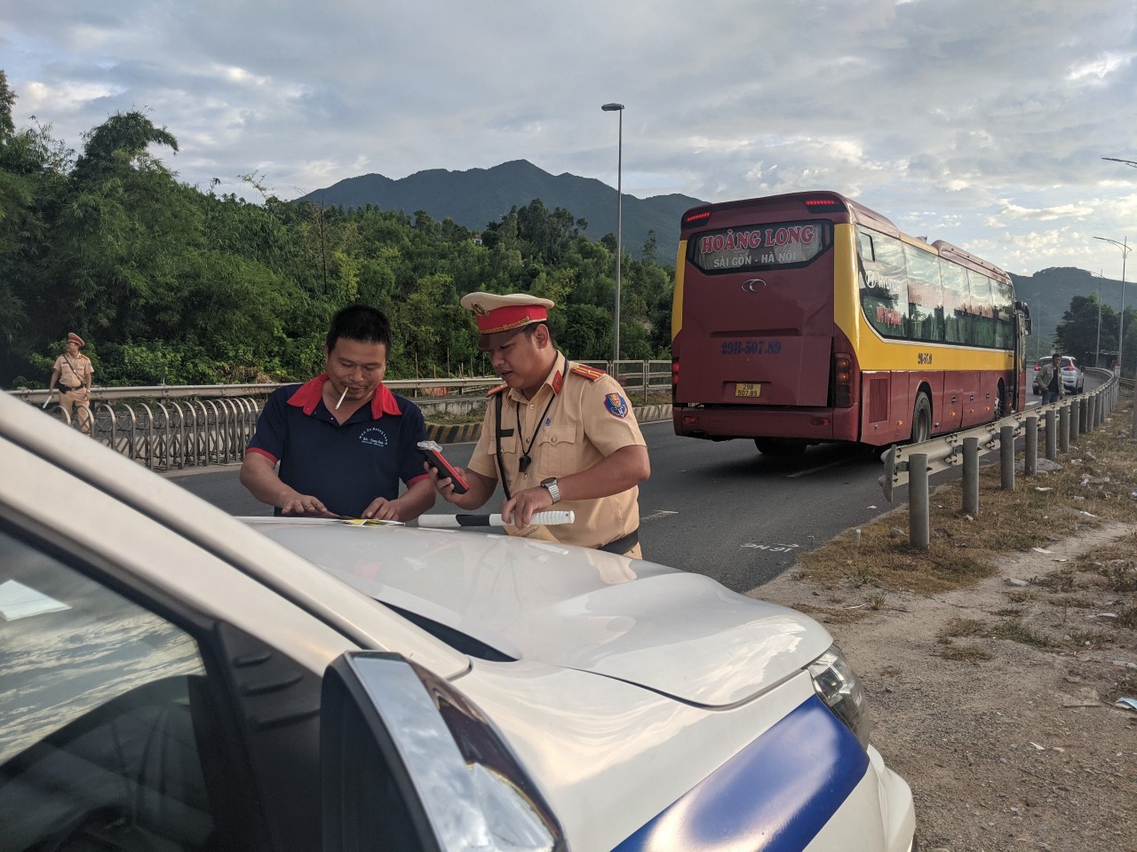 Có mặt tại Km 22 tuyến đường Hải Vân-Túy Loan, PV ghi nhận tổ công tác Trạm CSGT Hòa Nhơn do Trung tá Trương Công Cư chỉ huy gồm các cán bộ: Đại úy Nguyễn Mạnh Tuân, Thiếu tá Hứa Trung Dũng căng sức đảm bảo TTATGT, kiểm tra, kiểm soát các phương tiện xe khách, container có dấu hiệu vi phạm pháp luật về TTATGT. Kết thúc ca làm việc (từ 18h-22h), tổ công tác Trạm CSGT Hòa Nhơn do Trung tá Trương Công Cư chỉ huy bàn giao ca cho tổ công tác Trạm CSGT cửa ô Hòa Hiệp tiếp tục làm nhiệm vụ TTKS trên tuyến Hải Vân-Túy Loan từ 22h-2h sáng hôm sau.
