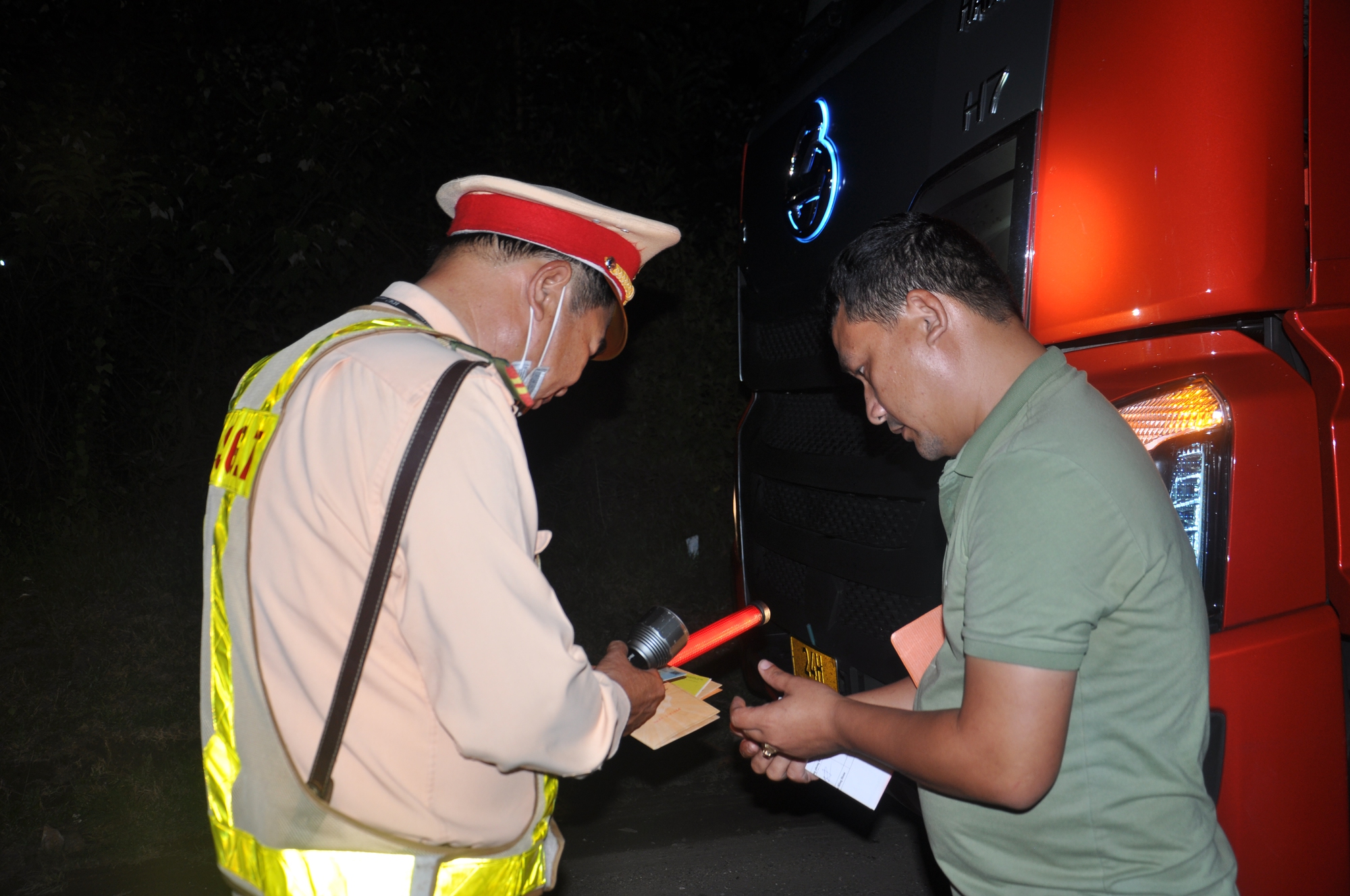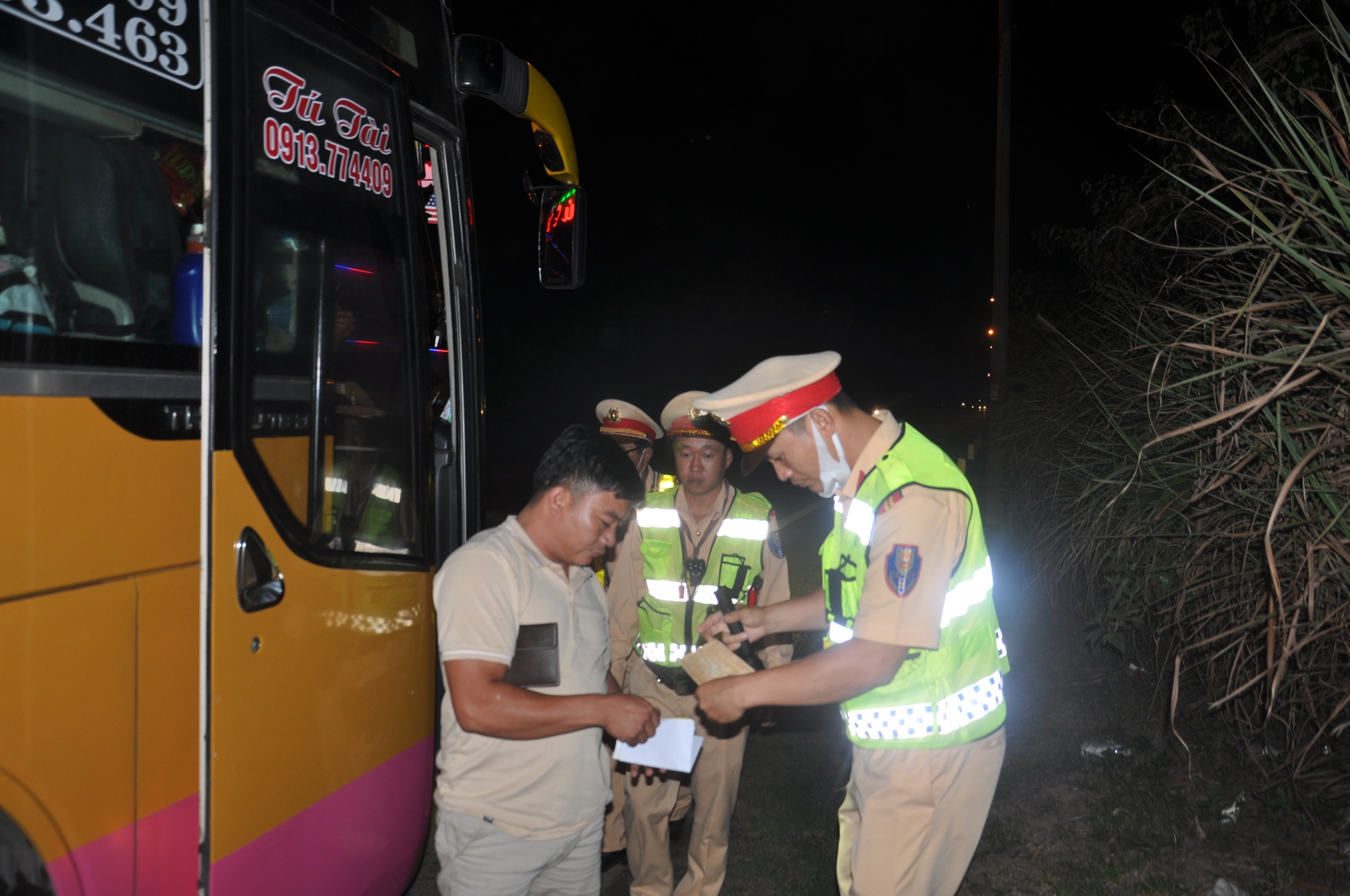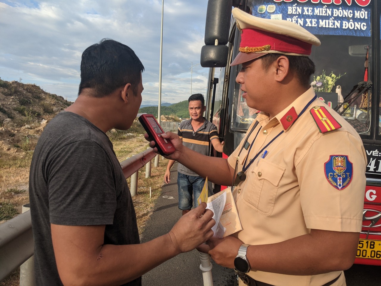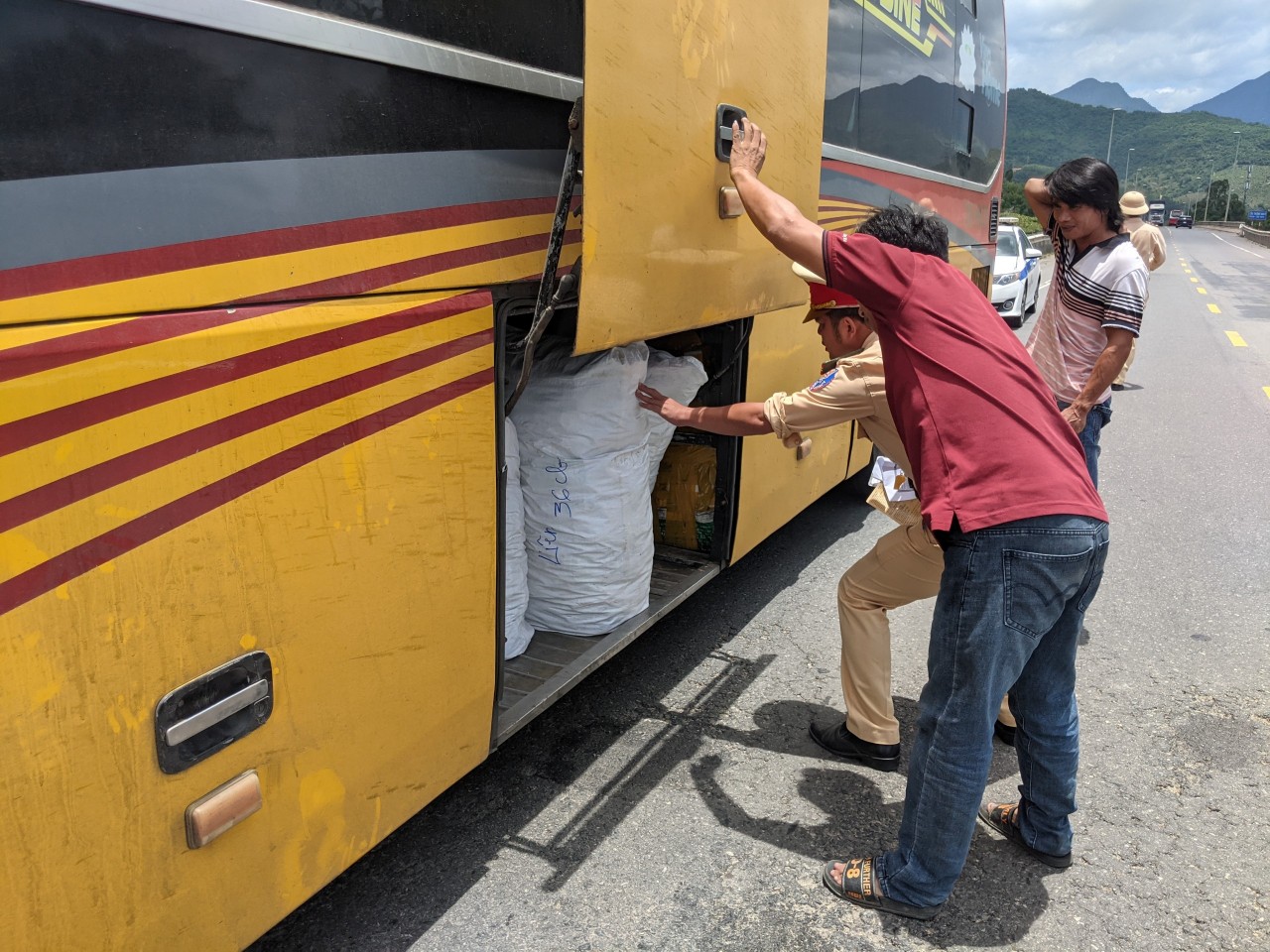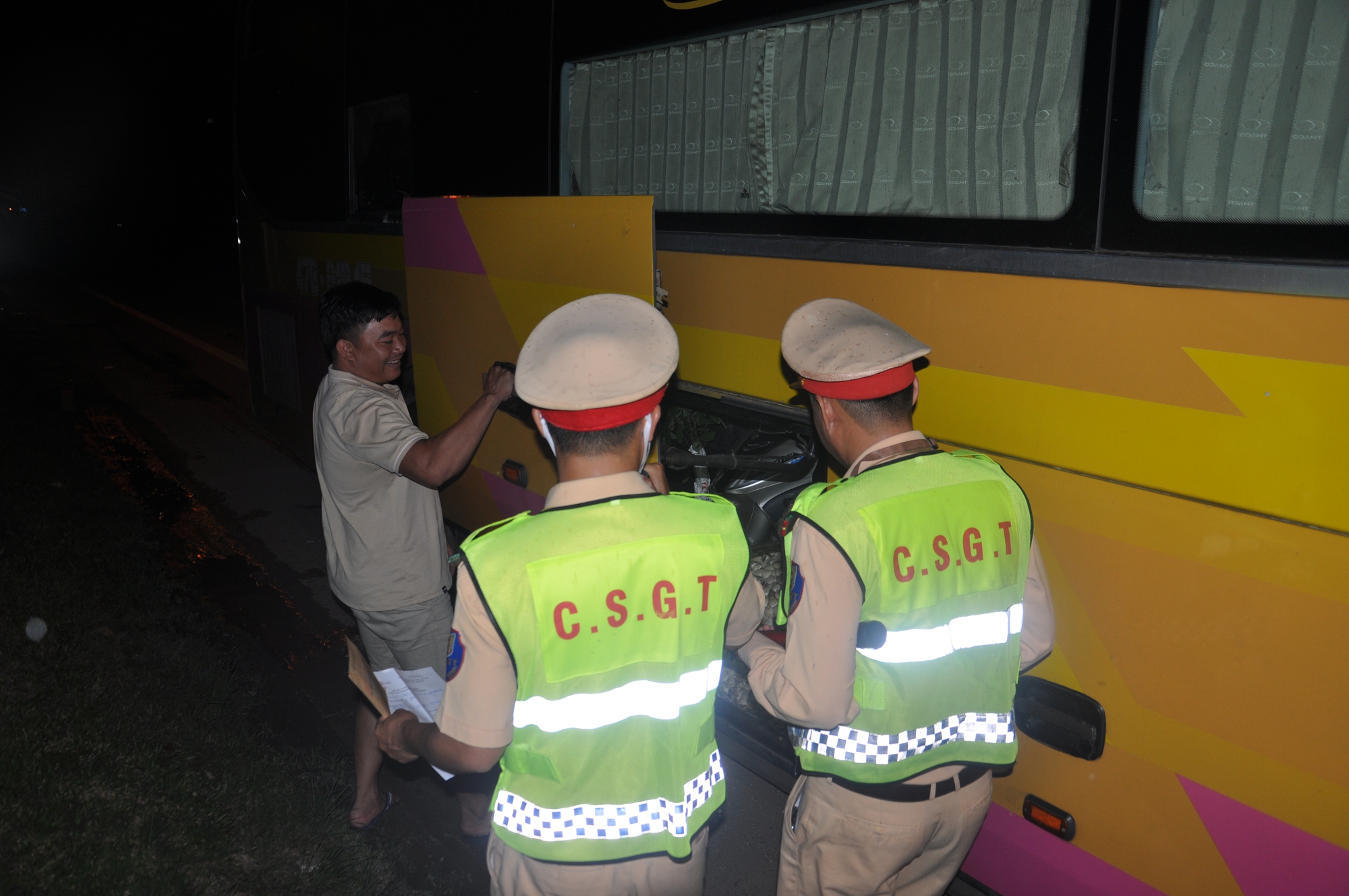 Có mặt tại Km 22 tuyến đường Hải Vân-Túy Loan, PV ghi nhận tổ công tác Trạm CSGT Hòa Nhơn do Trung tá Trương Công Cư chỉ huy gồm các cán bộ: Đại úy Nguyễn Mạnh Tuân, Thiếu tá Hứa Trung Dũng căng sức đảm bảo TTATGT, kiểm tra, kiểm soát các phương tiện xe khách, container có dấu hiệu vi phạm pháp luật về TTATGT. Kết thúc ca làm việc (từ 18h-22h), tổ công tác Trạm CSGT Hòa Nhơn do Trung tá Trương Công Cư chỉ huy bàn giao ca cho tổ công tác Trạm CSGT cửa ô Hòa Hiệp tiếp tục làm nhiệm vụ TTKS trên tuyến Hải Vân-Túy Loan từ 22h-2h sáng hôm sau.