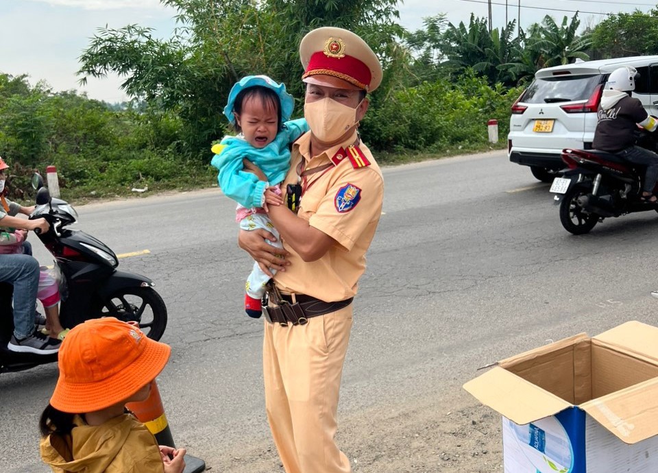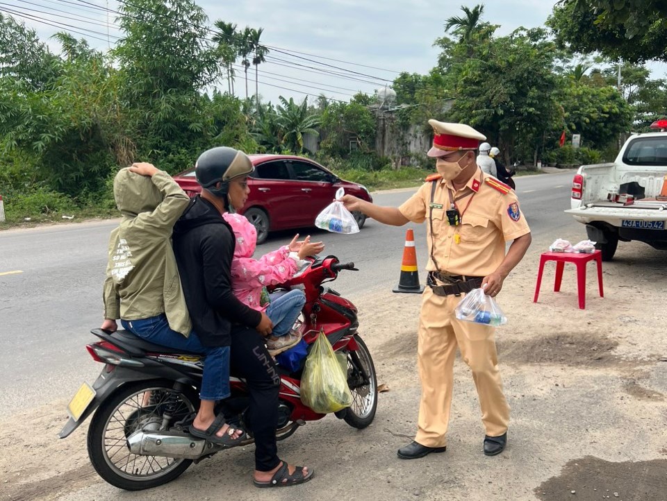 Ghi nhận tại Km 32 tuyến QL14B qua xã Hòa Khương (huyện Hòa Vang, TP. Đà Nẵng), PV Tạp chí Giao thông vận tải chứng kiến tổ công tác Trạm CSGT cửa ô Hòa Nhơn do Thiếu tá Nguyễn Việt Tuấn - Phó Trạm trưởng Trạm CSGT cửa ô Hòa Nhơn chỉ huy, gồm các cán bộ CSGT: Thiếu tá Nguyễn Hùng Sinh, Đại uý Mai Thanh Hùng đang vừa TTKS, hỗ trợ, giúp người dân đi đường, vừa phát nước, đồ ăn nhẹ cho người dân đi đường. Cán bộ CSGT còn nhắc nhở người dân giữ gìn sức khỏe, tỉnh táo, lái xe an toàn.