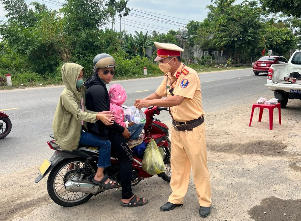 Lực lượng CSGT Đà Nẵng tiếp nước, đồ ăn nhẹ cho một gia đình di chuyển bằng xe máy trên tuyến QL14 trong sáng 2/9