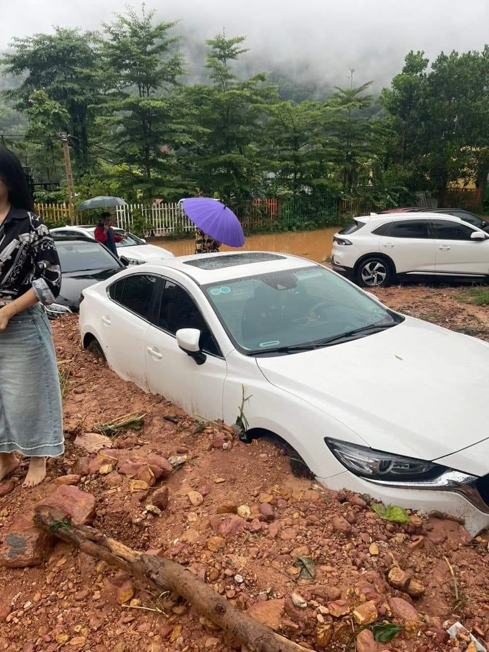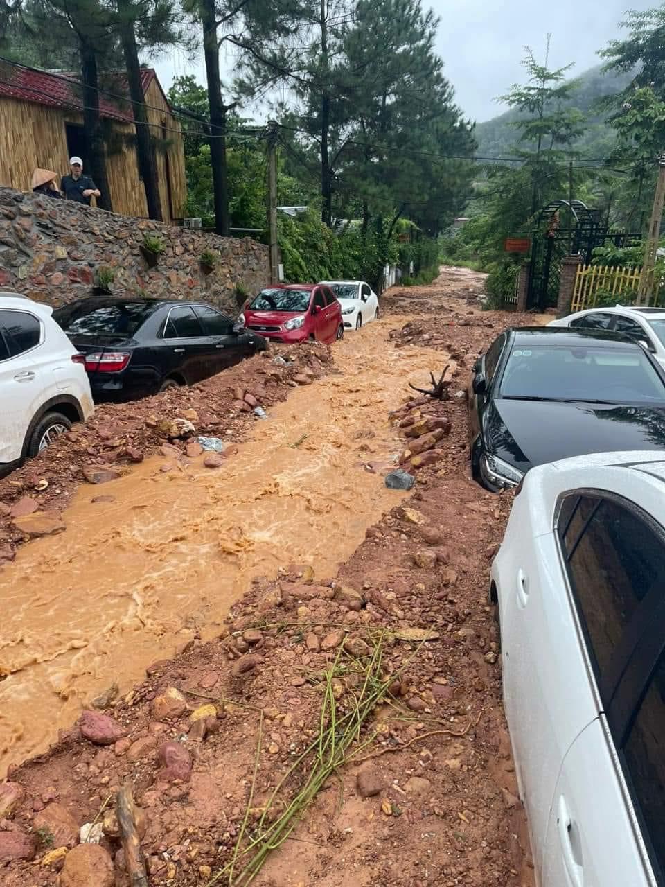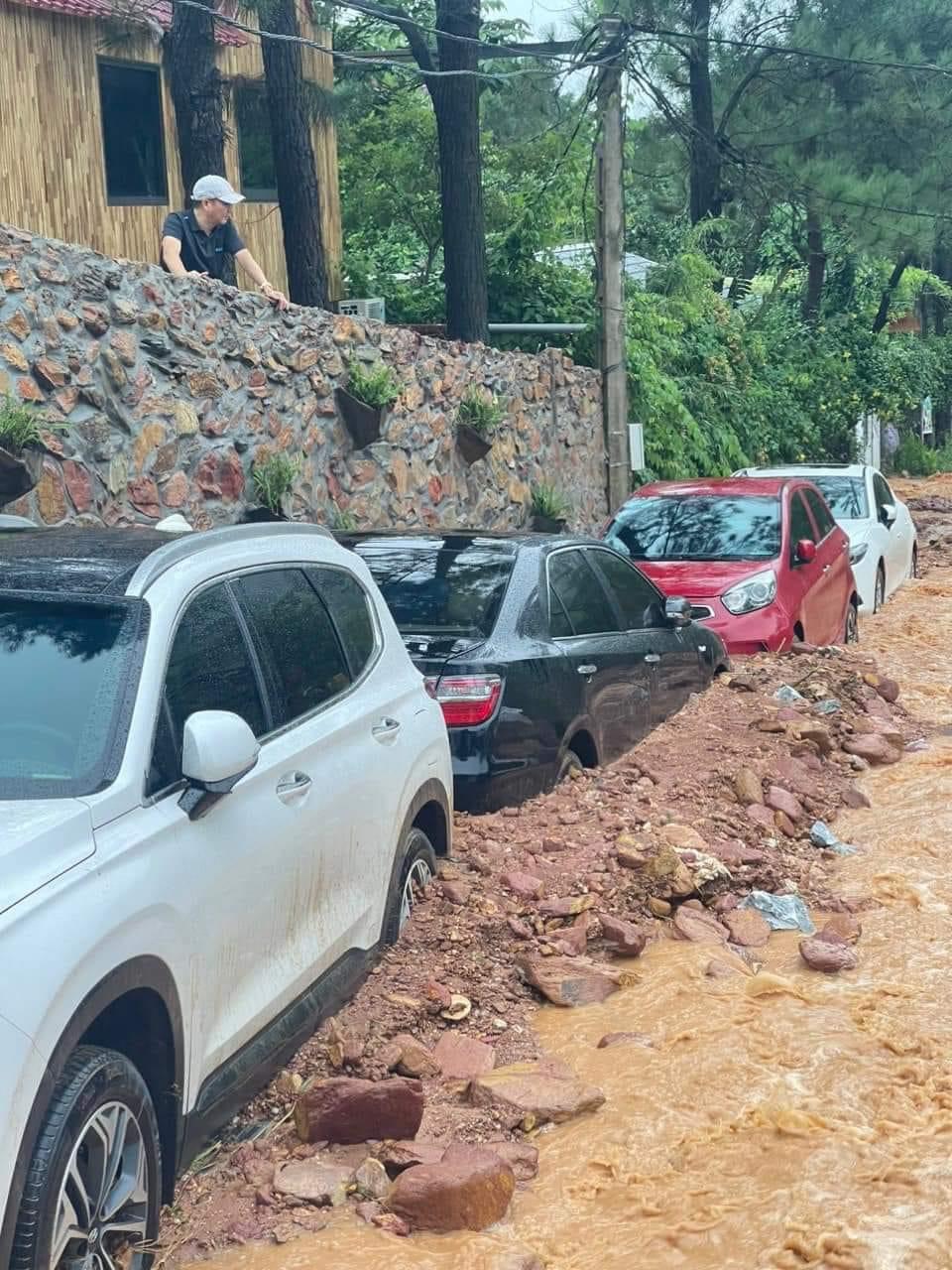 Cùng với đó dòng nước lũ kéo theo lượng đất đá xuống lấp kín nhiều tuyến đường khiến các phương tiện không thể di chuyển. Nhiều ôtô của khách du lịch cũng bị bùn đất bủa vây ngập hết phần bánh xe không thể di chuyển.