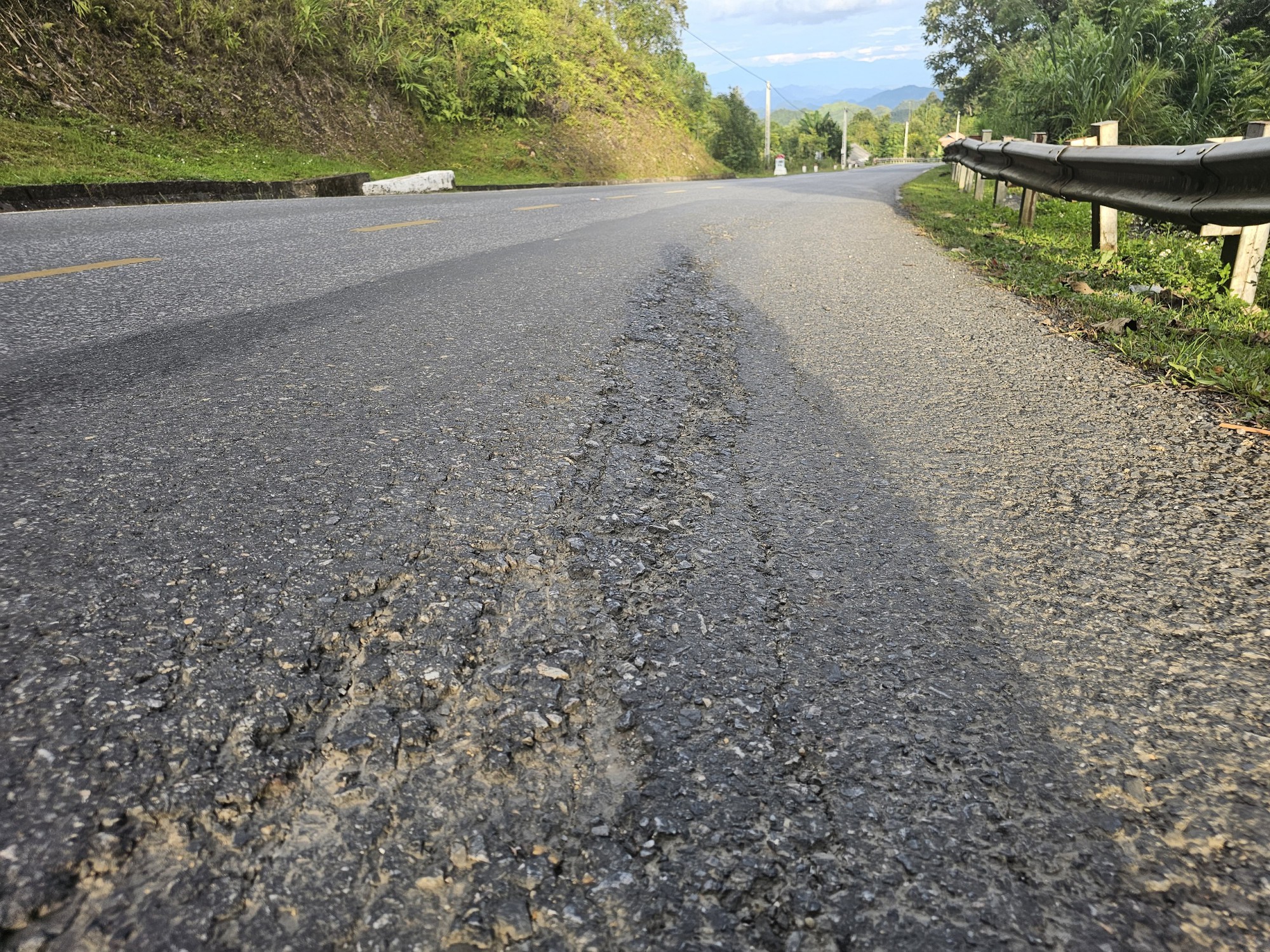 Trên đoạn tuyến qua tỉnh Sơn La, dễ bắt gặp các vị trí mặt đường không còn sơn vạch kẻ lề đường, mặt đường bị bong bật, mép đường nhựa bị xệ nứt như trên (chụp tại khu vực khu vực Km361+200)