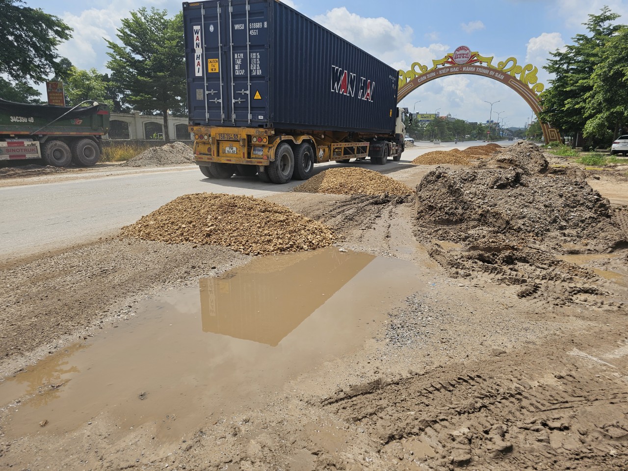 Theo thiết kế được duyệt, phần đường bị hư hỏng và lề đường được gia cố bằng cách đào bỏ kết cấu cũ và gia cố bằng 45cm đá dăm (15cm đá dăm loại I, 30cm đá dăm loại II) để thay thế và sau đó tưới thấm bằng nhũ tương. Tuy nhiên, hiện trường công trình cho thấy, lớp đá dăm trên cùng sau khi được lu lèn chặt có lẫn bùn đất, tạp chất