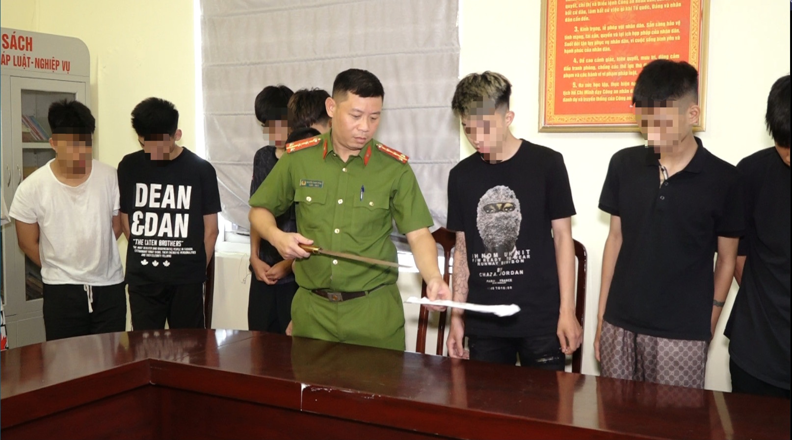 Hình ảnh nhóm "quái xế" phóng xe máy, chém người vô cớ náo loạn đường phố Hà Nội bị tạm giữ tại cơ quan công an