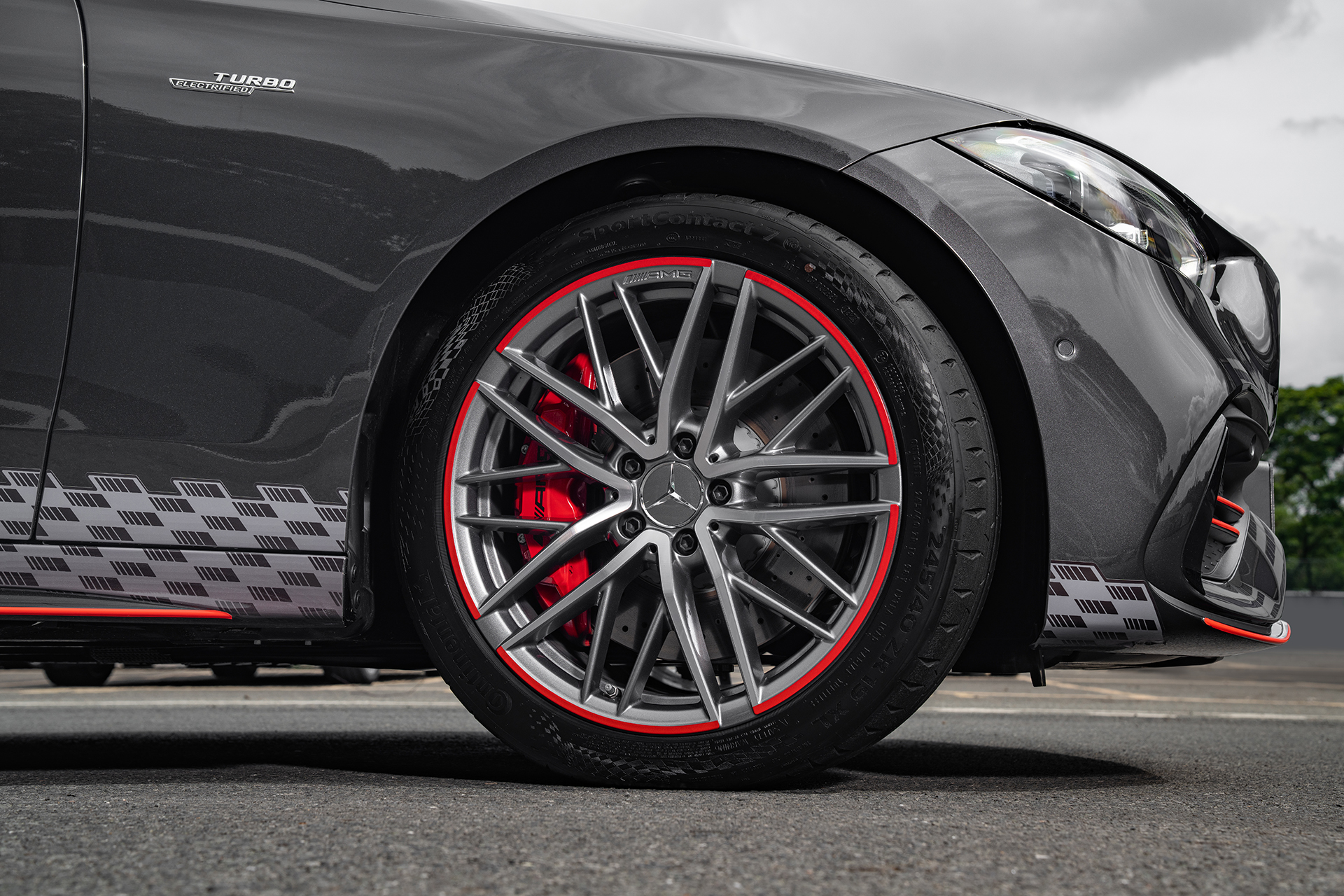 Một điểm nhấn đặc trưng trên những chiếc xe hiệu suất cao của thương hiệu Mercedes-AMG là hệ thống phanh thể thao AMG được thiết kế với 4 pít-tông màu bạc và kẹp phanh thể thao sơn đỏ với ký hiệu "AMG" màu đen. Hệ thống phanh giúp xe đảm bảo hiệu suất phanh tốt nhất trong cả các tình huống di chuyển hàng ngày lẫn trên đường đua.