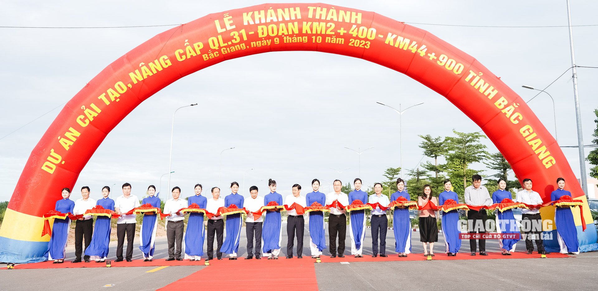 Bộ trưởng Bộ GTVT Nguyễn Văn Thắng cùng lãnh đạo tỉnh Bắc Giang và đại diện các cơ quan, đơn vị thực hiện nghi thức cắt băng khánh thành Dự án Cải tạo, nâng cấp QL31 đoạn Km2+400 - Km44+900, tỉnh Bắc Giang.