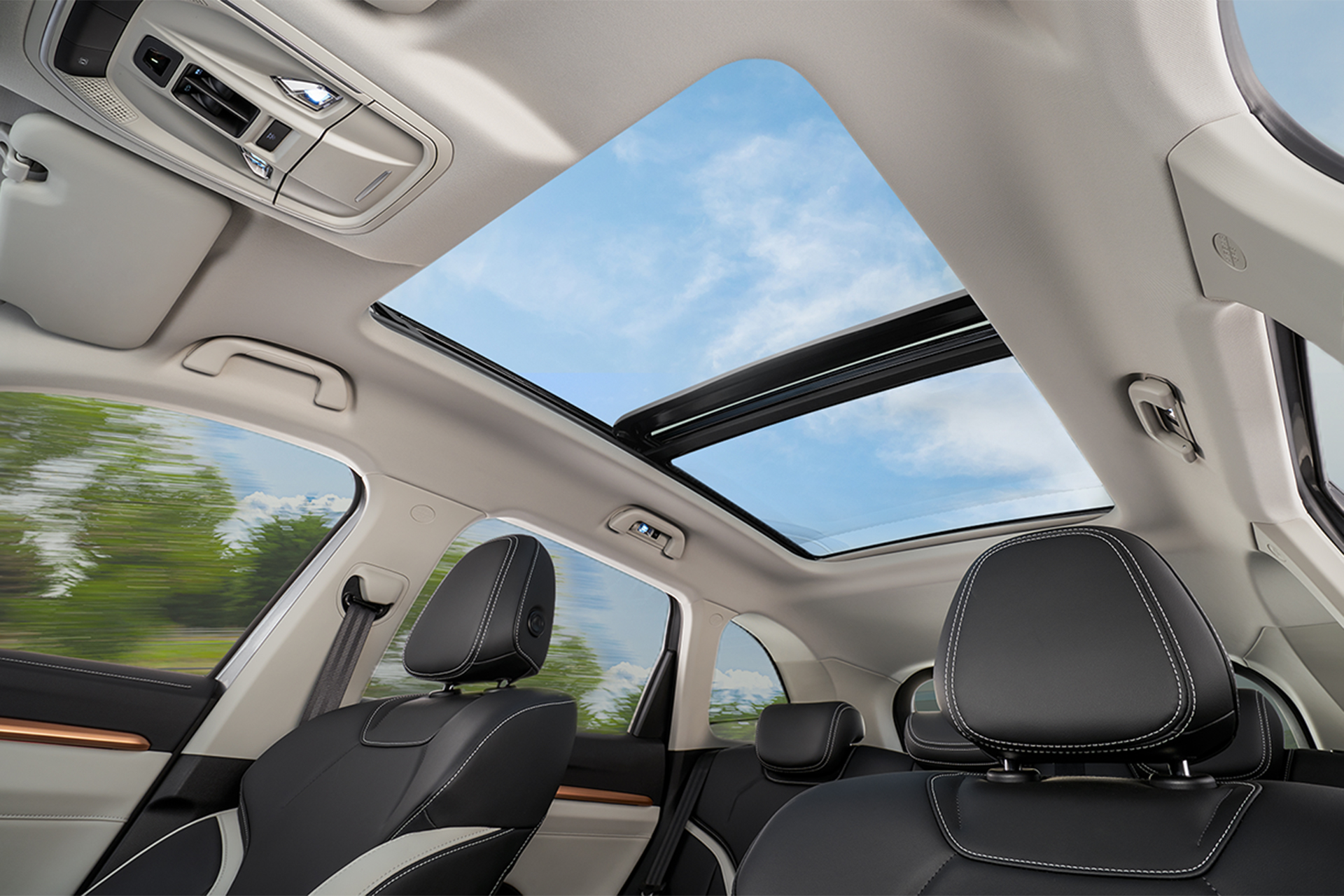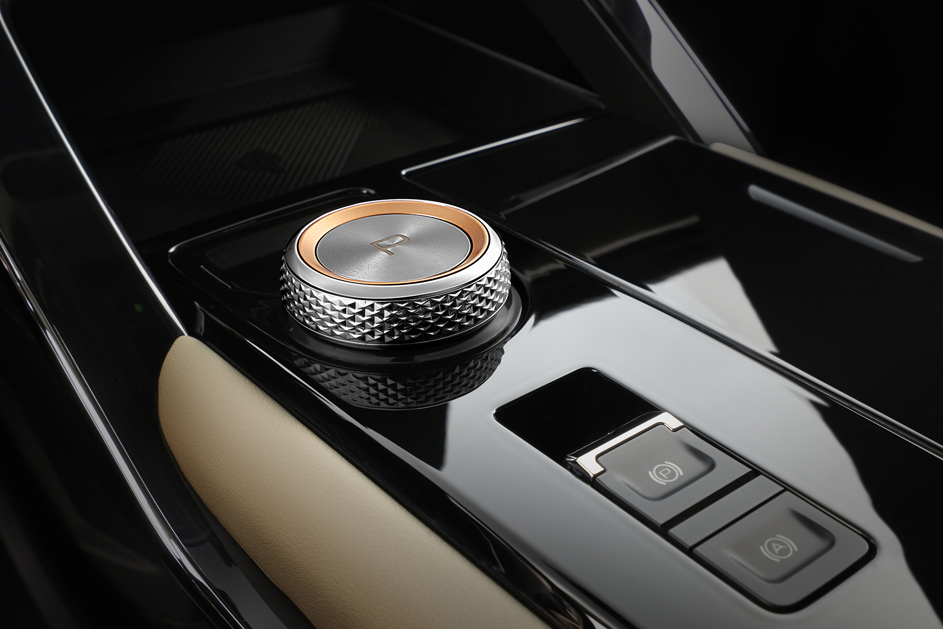 Cửa sổ trời toàn cảnh siêu rộng và cần số điện tử dạng núm xoay.