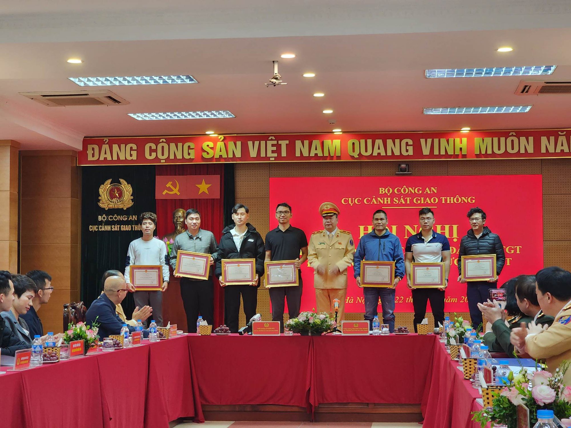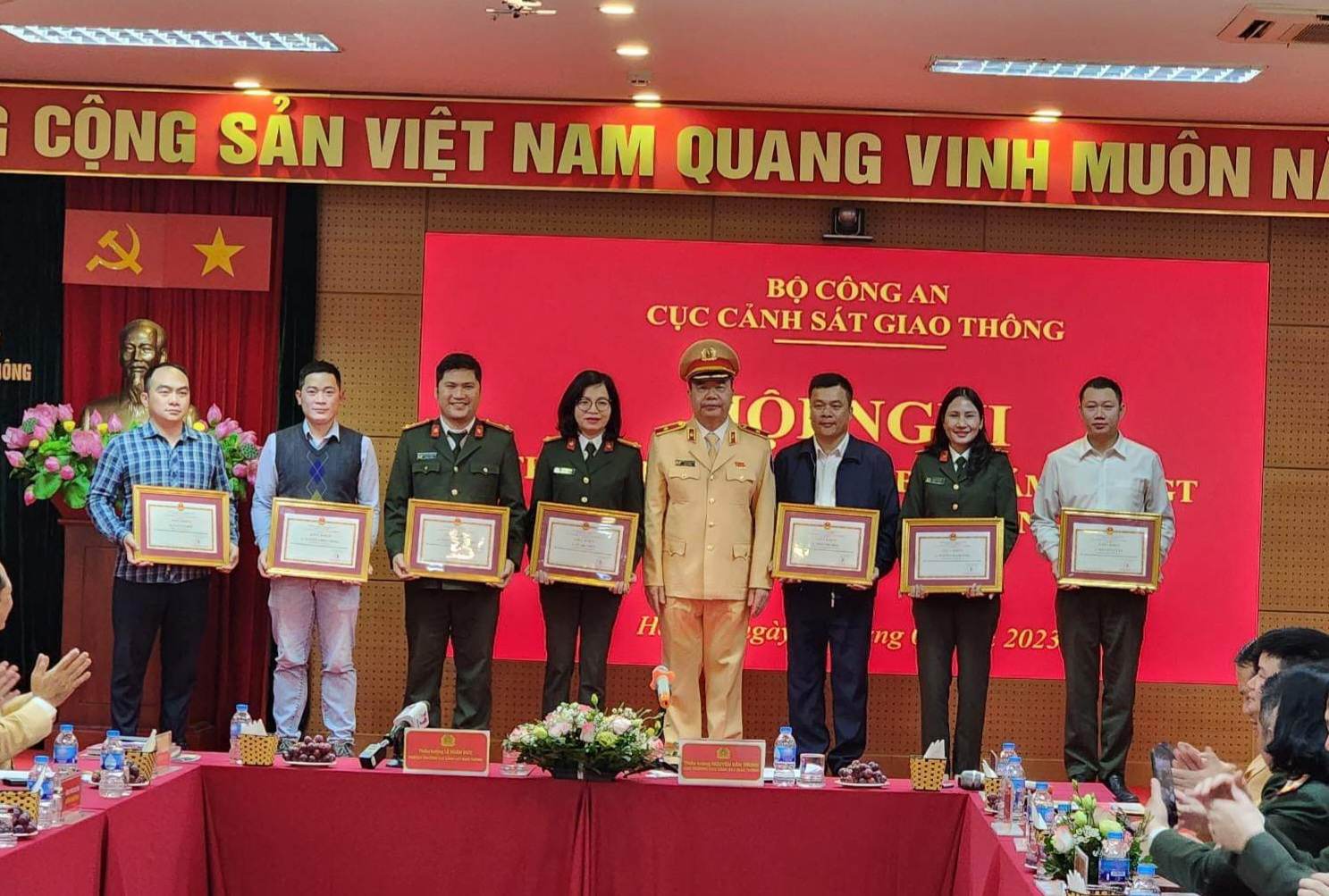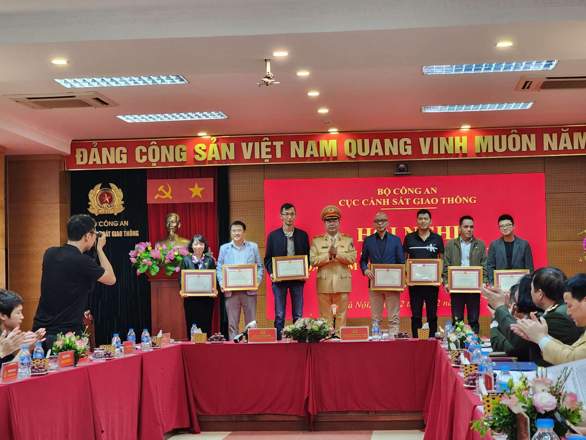Thiếu tướng Nguyễn Văn Trung, Cục trưởng Cục CSGT (Bộ Công an) tặng bằng khen cho các phóng viên báo, đài trong đó có Tạp chí Giao thông vận tải