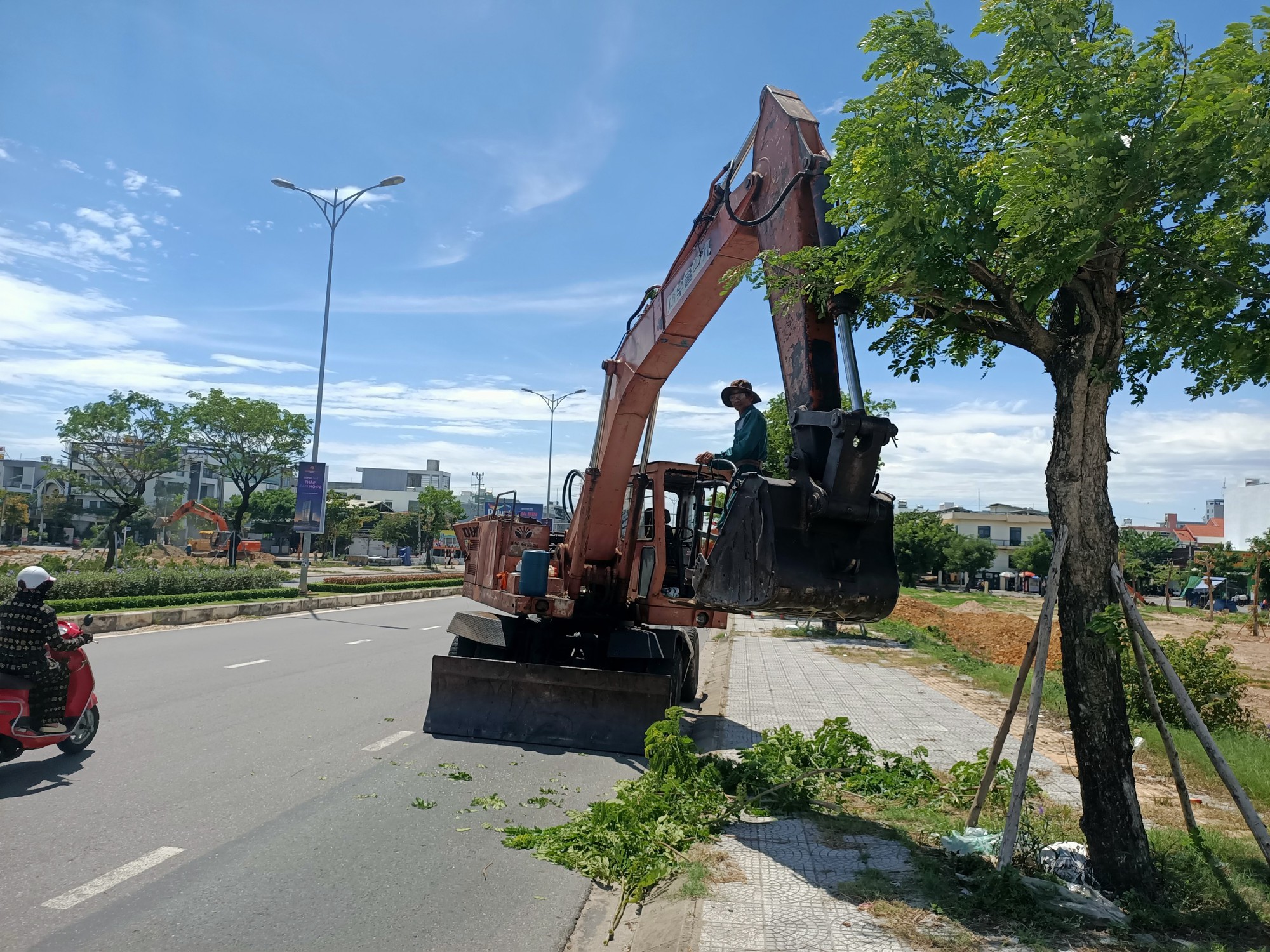 Các xe múc liên tục thao tác nâng hạ gàu múc, thân xe liên tục chuyển hướng, quay ngang, vươn dài ra giữa mặt đường, gây xung đột giao thông, tiềm ẩn TNGT. Cây xanh được cắt tỉa vung vãi khắp mặt đường, lề đường không được kịp thời thu dọn, gây cản trở giao thông.
