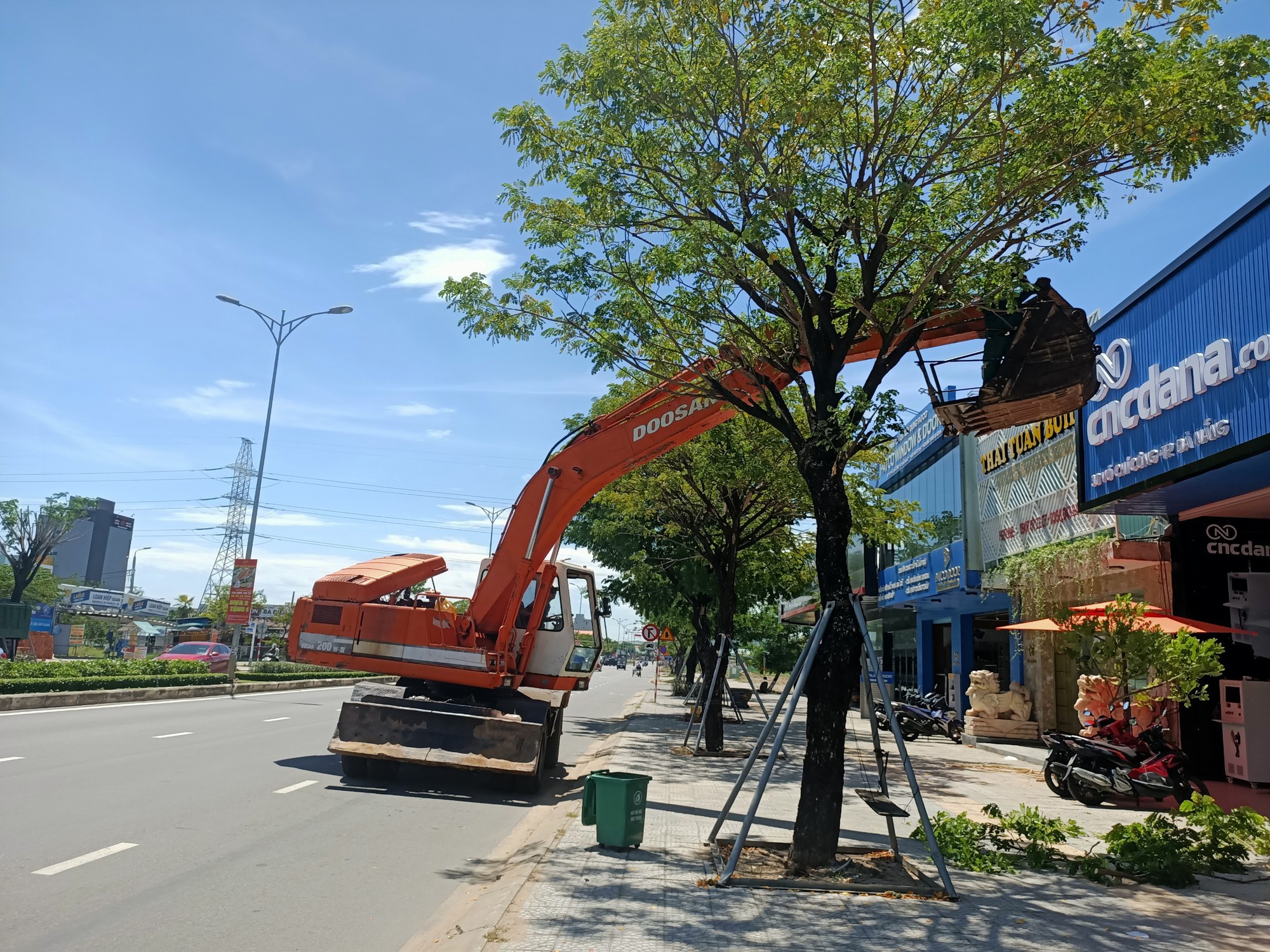 Ngày 13-14/9, đi dọc tuyến đường Võ Chí Công đoạn từ chân cầu Nguyễn Tri Phương đến cầu Khuê Đông (phường Hòa Xuân, quận Cẩm Lệ, TP. Đà Nẵng), PV Tạp chí Giao thông vận tải ghi nhận 5 máy múc loại công suất lớn được sử dụng phục vụ cắt tỉa cây xanh.