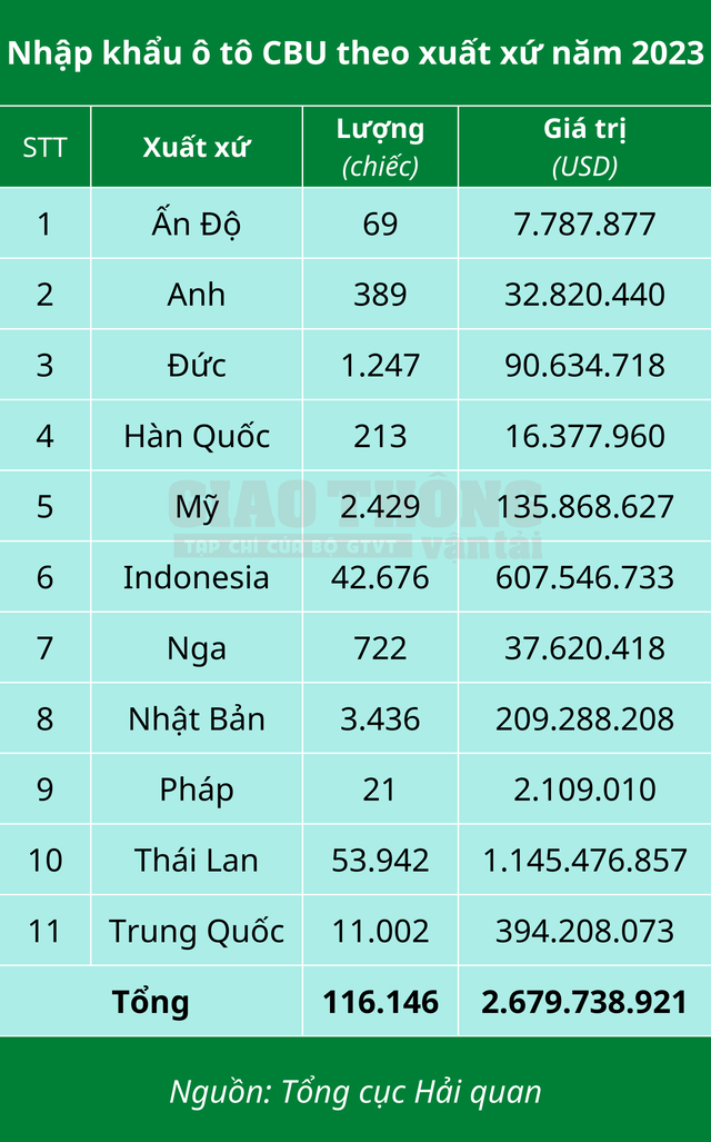 Báo cáo của Tổng cục Hải quan cho biết, cộng dồn cả năm 2023 Việt Nam đã nhập khẩu 116.146 ô tô nguyên chiếc (CBU), tương ứng là mức giá trị kim ngạch 2,679 tỷ USD.
