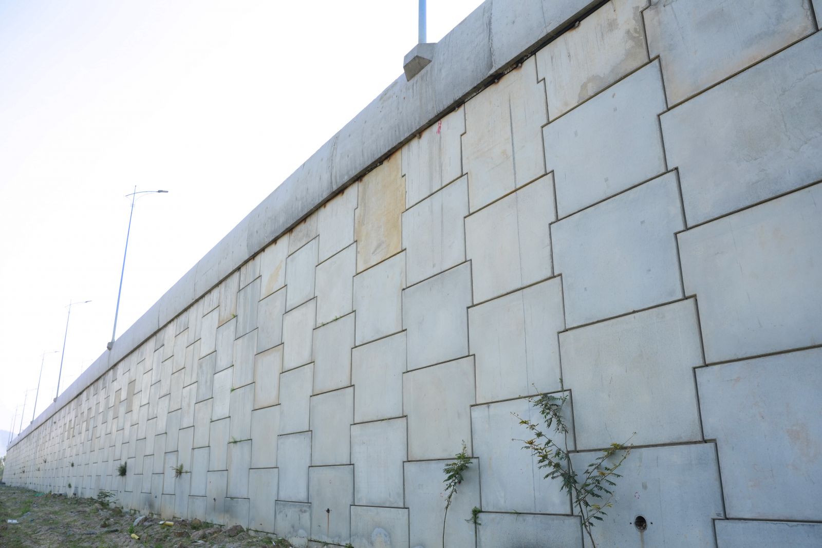 Tại vị trí này, thay vì sử dụng các giải pháp truyền thống, phương án tường chắn có cốt được triển khai theo hướng bao bọc thân mố, hình thành một khối kết cấu tổng hợp giữa mố cầu và đất gia cường. Cách làm này mang lại "lợi ích kép": Về chịu lực, hệ tường chắn giúp bao bọc và giảm áp lực đất chủ động tác động lên thân mố, hỗ trợ phân phối đồng đều tải trọng vào hệ cọc khoan nhồi bên dưới. Về thẩm mỹ giúp xóa bỏ cảm giác nặng nề của các khối bê tông khổng lồ, tạo ra sự đồng bộ về cảnh quan cho toàn bộ nút giao.