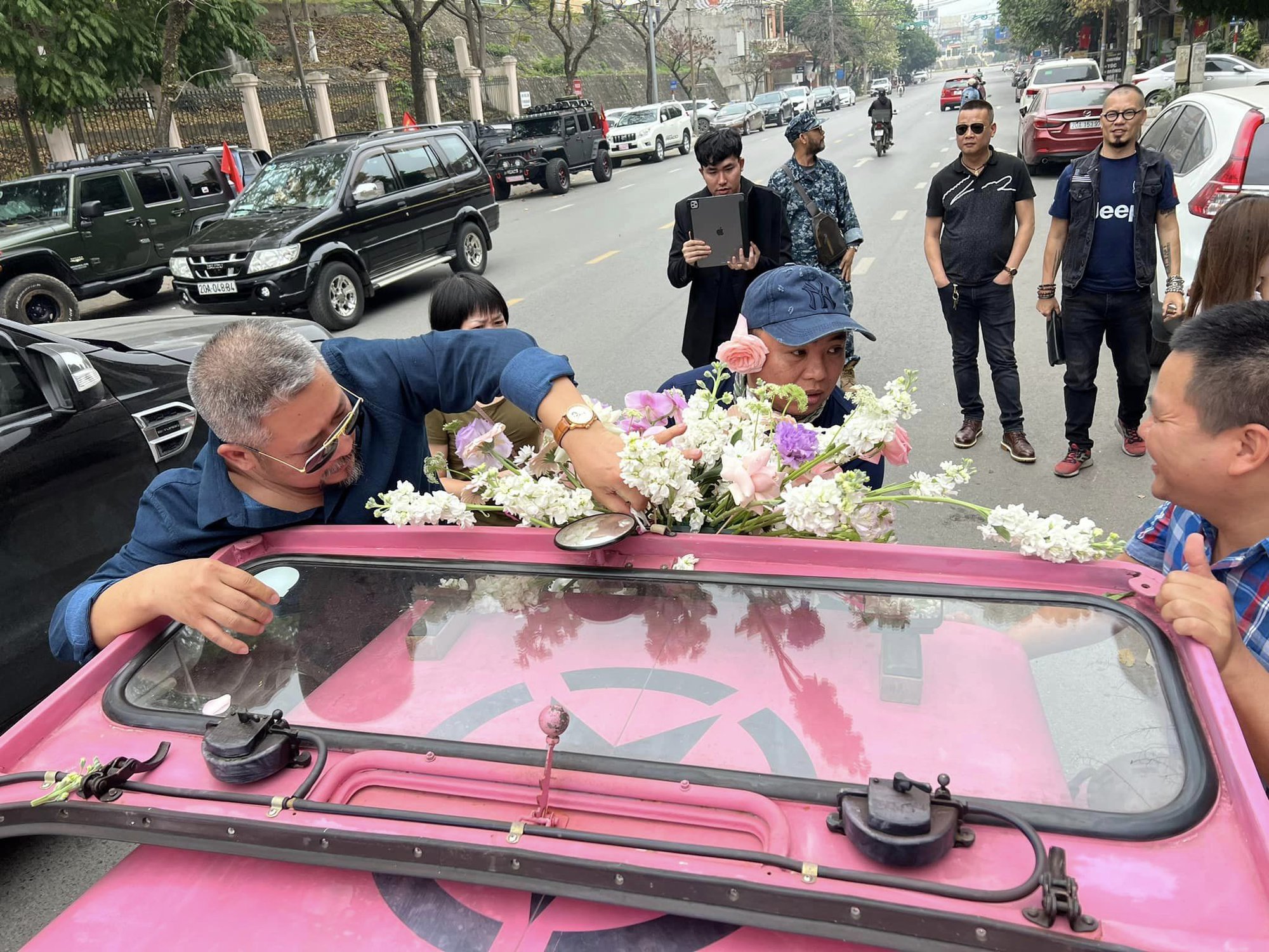 Trong hai ngày 11 và 12/3, khu vực nhà chú rể tại thành phố Thái Nguyên đã có hơn 20 chiếc xe Jeep các loại sẵn sàng cho buổi lễ đón dâu. Chú rể Nông Quốc Huy đã chọn cho mình một chiếc xe Jeep Winlly mầu hồng khá cá tính làm xe đón dâu.