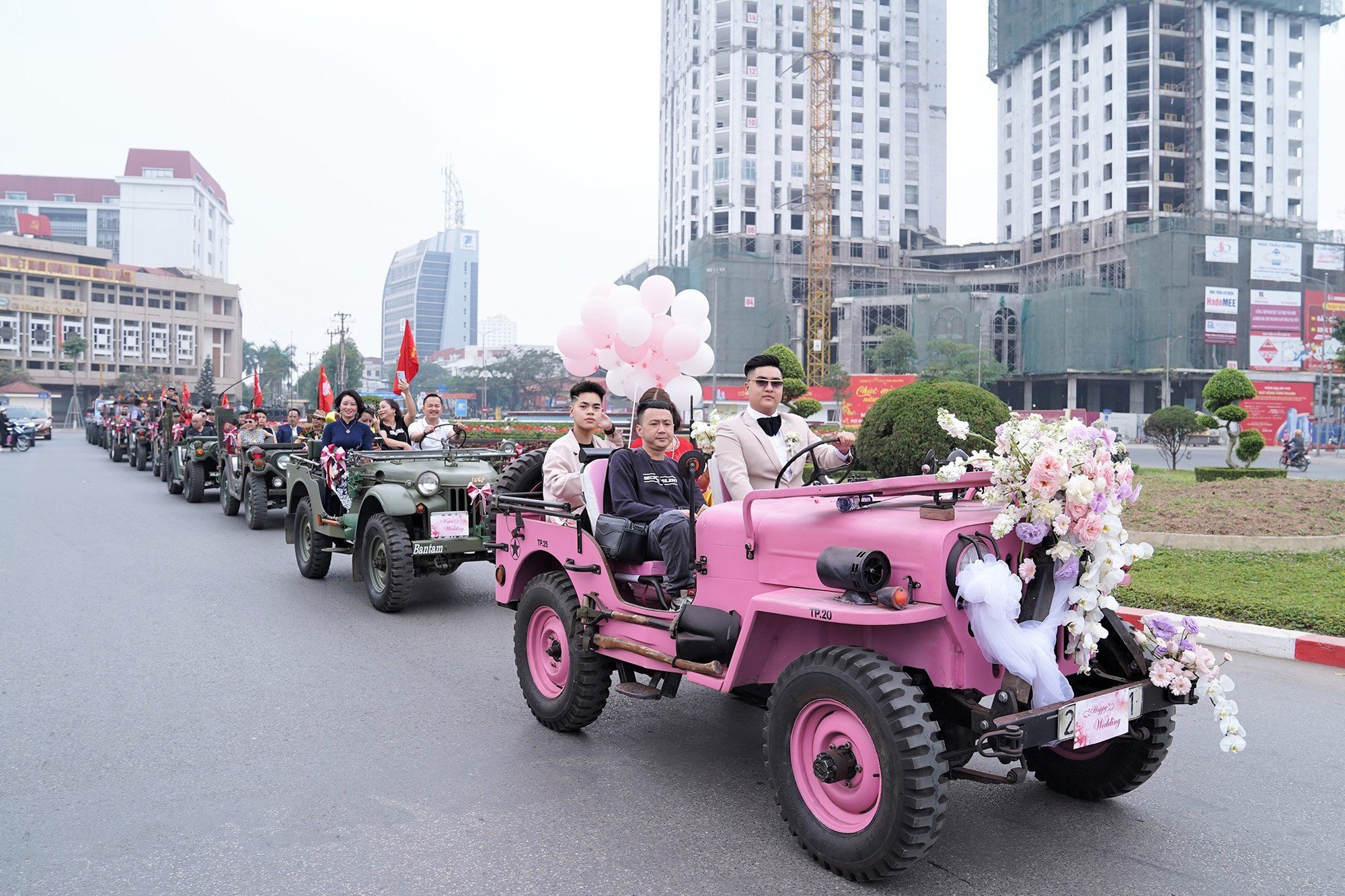 Nhìn đoàn xe Jeep xếp hàng dài chạy ra khu ngoại ô thành phố Thái Nguyên đón dâu khiến cho bà con hai bên đường không khỏi tò mò. Chú rể cũng tỏ ra khá tự tin cầm lái chiếc xe cưới đầy cá tính được trang chí đơn giản nhưng rất lãng mạn. Đoàn xe dừng lại điểm cuối là nơi tổ chức buổi lễ trong sự hân hoan của người thân và bè bạn.