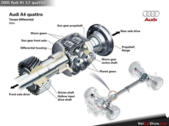 Hệ thống dẫn động bốn bánh toàn thời gian Quattro luôn có 3 bộ vi sai, trong đó Torsen được coi là bộ vi sai trung tâm có thể phân phối mô-men xoắn tới cầu trước và cầu sau. Sau đó, thông qua hai bộ vi sai còn lại để phân bổ mô-men xoắn tới các bánh xe.