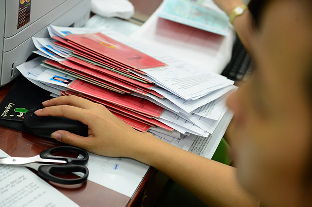 | Rất nhiều hồ sơ làm thủ tục làm chứng minh nhân dân chờ giải quyết - Ảnh: Quang Định |