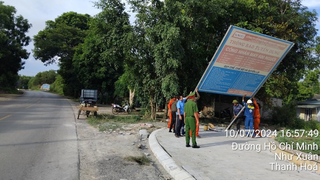 Lực lượng chức năng tháo dỡ biển quảng cáo trái phép trên QL1