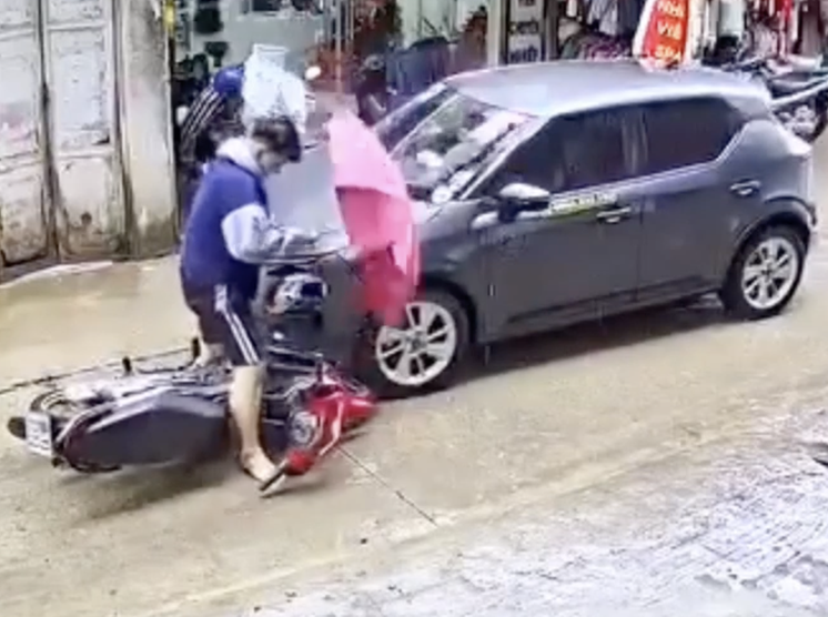 Người điều khiển xe máy dùng ô che mưa đâm vào ô tô ngược chiều.