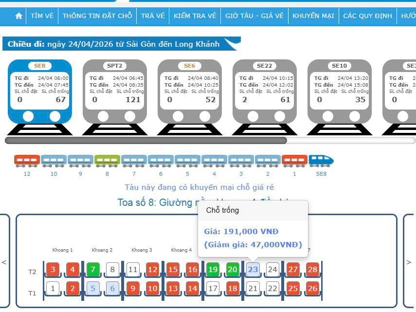 Chương trình đang áp dụng thí điểm cho các đoàn tàu SE5, SE6, SE7, SE8, thời gian từ nay đến hết 15/5/2026, sau đó sẽ được triển khai rộng rãi trên các đoàn tàu khác. Các vị trí giường nằm hoặc ghế ngồi có giá ưu đãi được hiển thị chữ số màu xanh nhạt trên hệ thống, giúp hành khách dễ dàng nhận biết và lựa chọn.