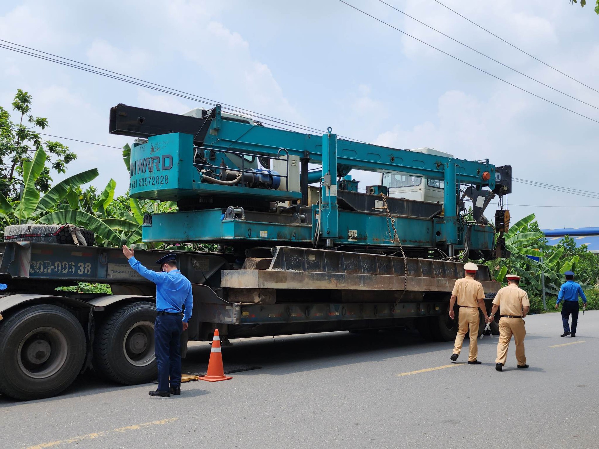 Sáng 7/6, có mặt tại Tỉnh lộ 418 qua địa bàn xã Võng Xuyên, huyện Phúc Thọ (Hà Nội), PV Tạp chí GTVT ghi nhận tổ công tác liên ngành Đội TTGT huyện Phúc Thọ (thuộc Thanh tra Sở GTVT Hà Nội) và Đội CSGT trật tự Công an huyện Phúc Thọ (Hà Nội) đang tiến hành phân luồng giao thông đảm bảo an toàn qua khu vực xe đầu kéo BKS 29H-791.34, kéo theo rơ móoc 36R-006.38 vi phạm đỗ dừng trên địa bàn.