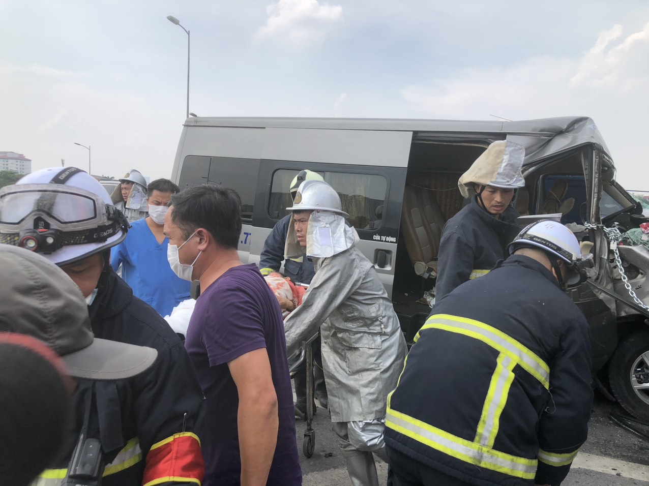 Đội Cảnh sát PCCC &CNCH Công an quận Hoàng Mai đã xuất 2 xe cùng nhiều cán bộ Cảnh sát PCCC&CNCH Công an quận đến hiện trường, sử dụng máy banh, cưa cắt thuỷ lực cứu 2 nạn nhân trong xe khách ra ngoài.