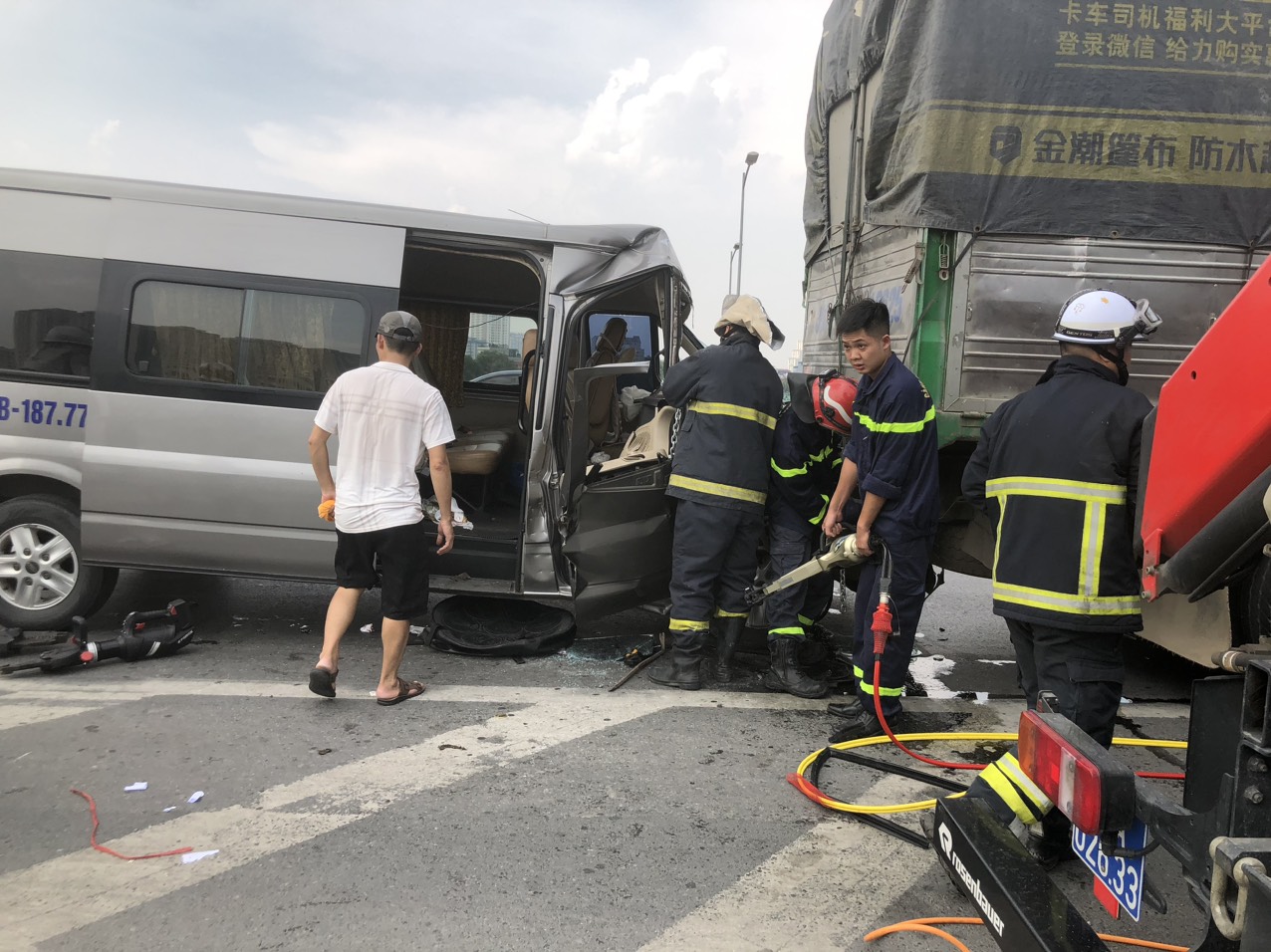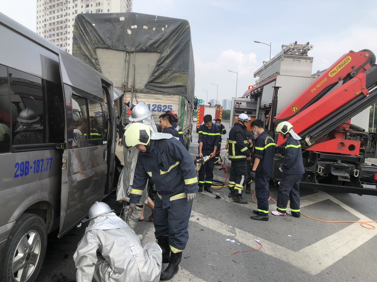 Một số hình ảnh hiện trường Cảnh sát PCCC quận Hoàng Mai cứu nạn người mắc kẹt trong xe khách sau tai nạn với xe tải trên đường vành đai 3