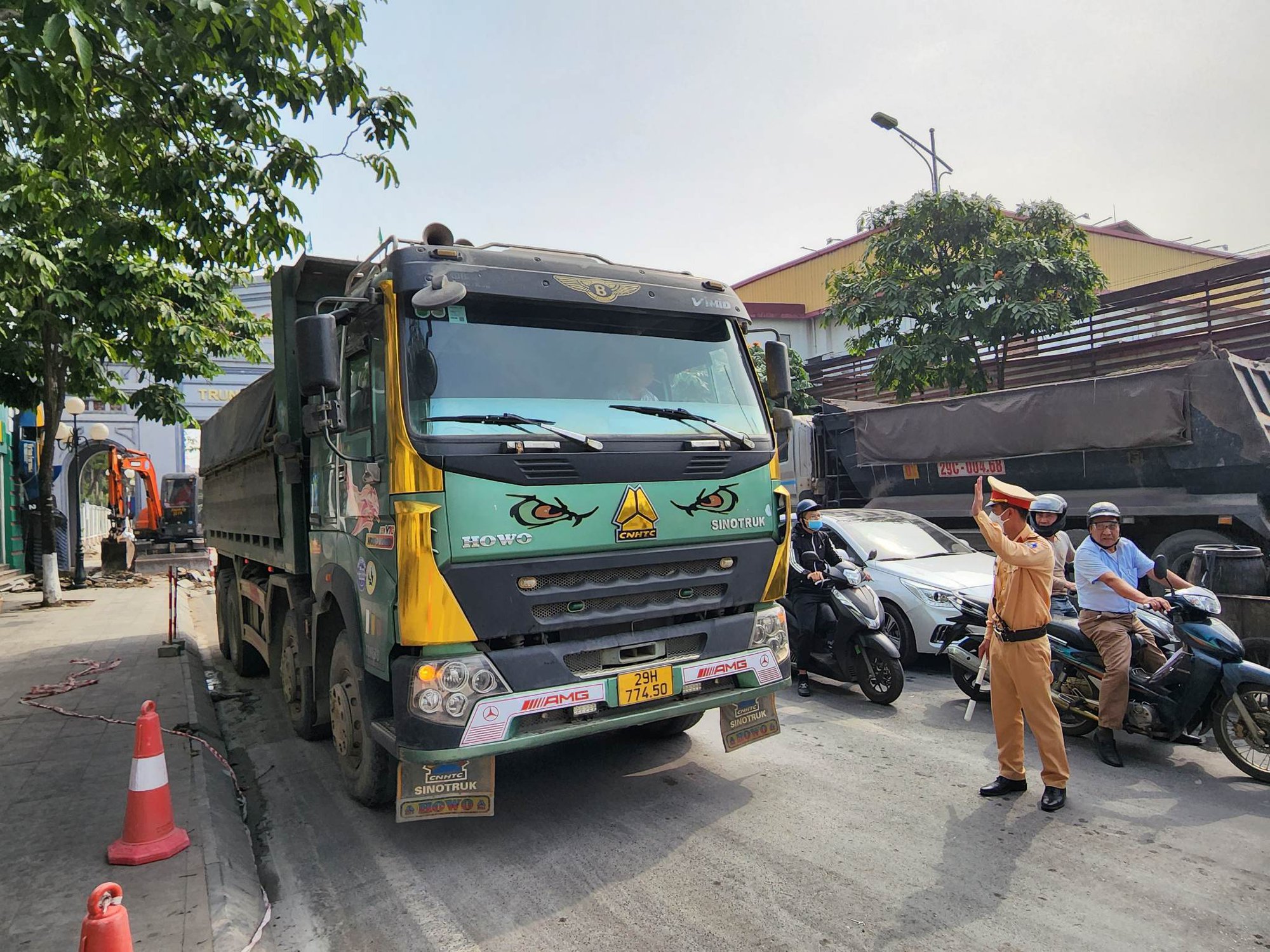 Ngay sau đó, tổ công tác Đội CSGT trật tự Công an huyện Đan Phượng (Hà Nội) tiến hành dừng 2 xe tải "hổ vồ" mang BKS 29H-552.xx và xe 29H-774.xx lưu thông từ đường nhánh khu công nghiệp huyện Đan Phượng ra QL32. Đáng lưu ý trong 2 xe này, thì xe tải "hổ vồ" BKS 29H-774.xx chở cát "có ngọn". Sau khi kiểm tra, Đội CSGT trật tự Công an huyện Đan Phượng đã lập biên bản xe tải "hổ vồ" BKS 29H-774.xx chở quá tải 48%.