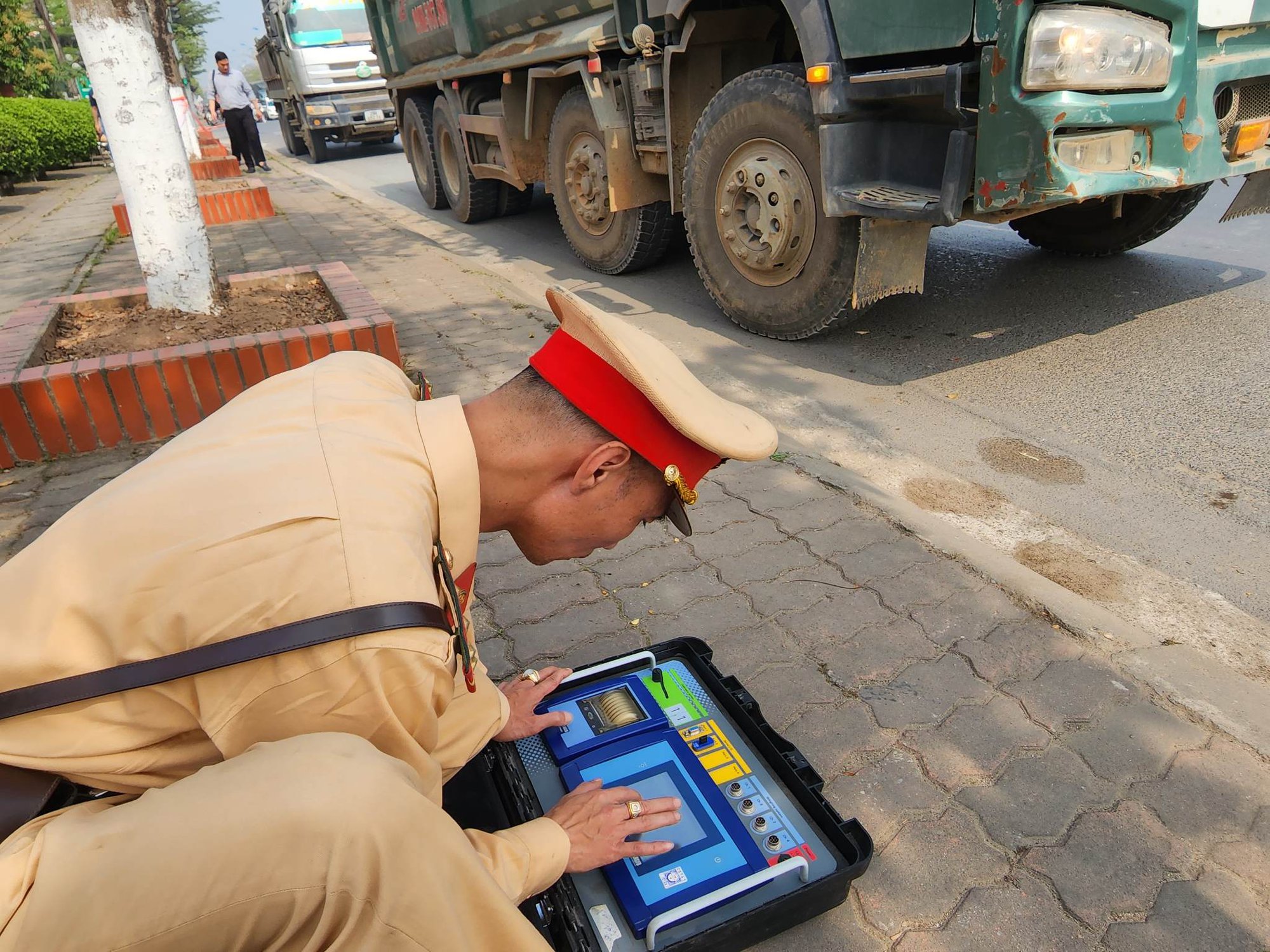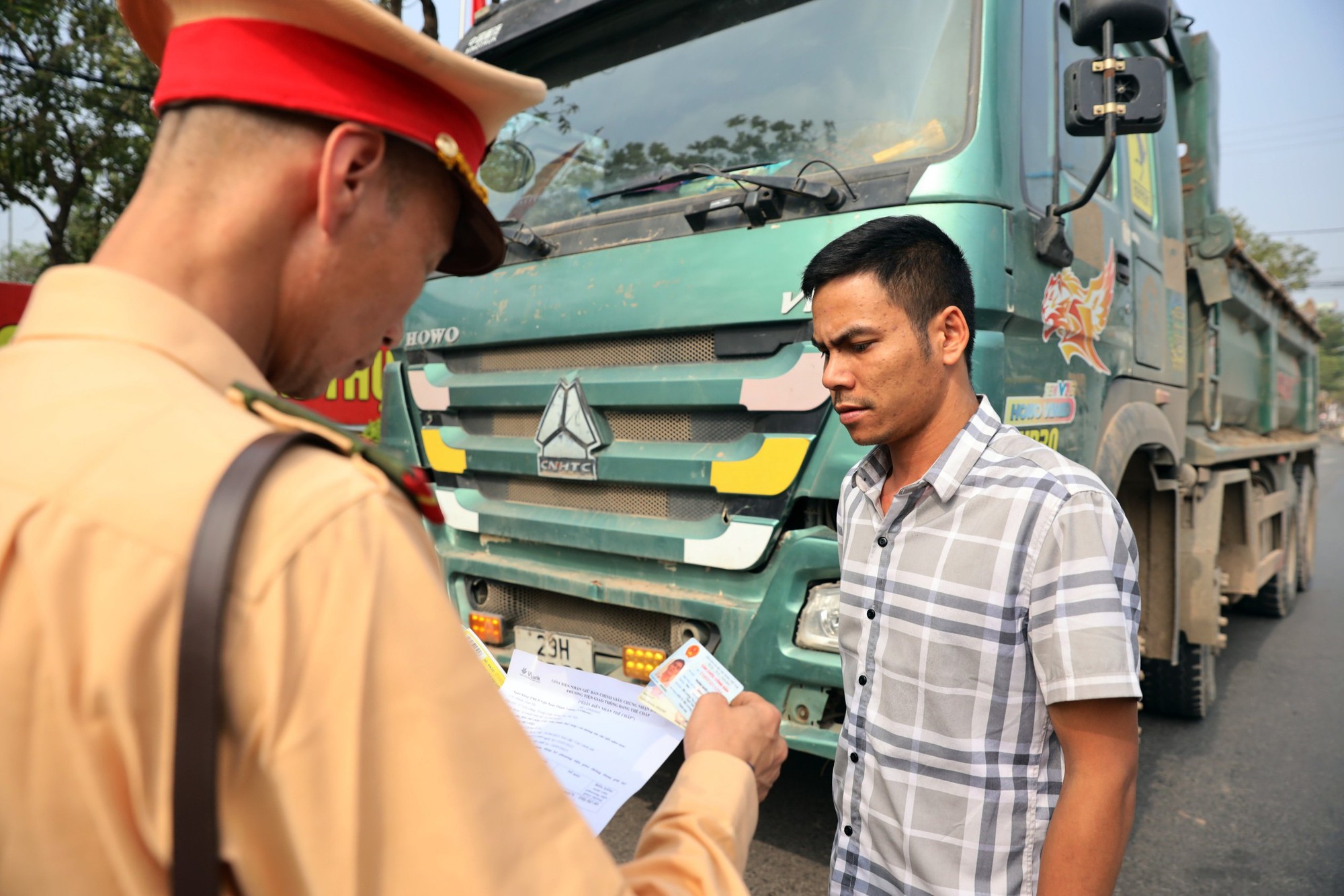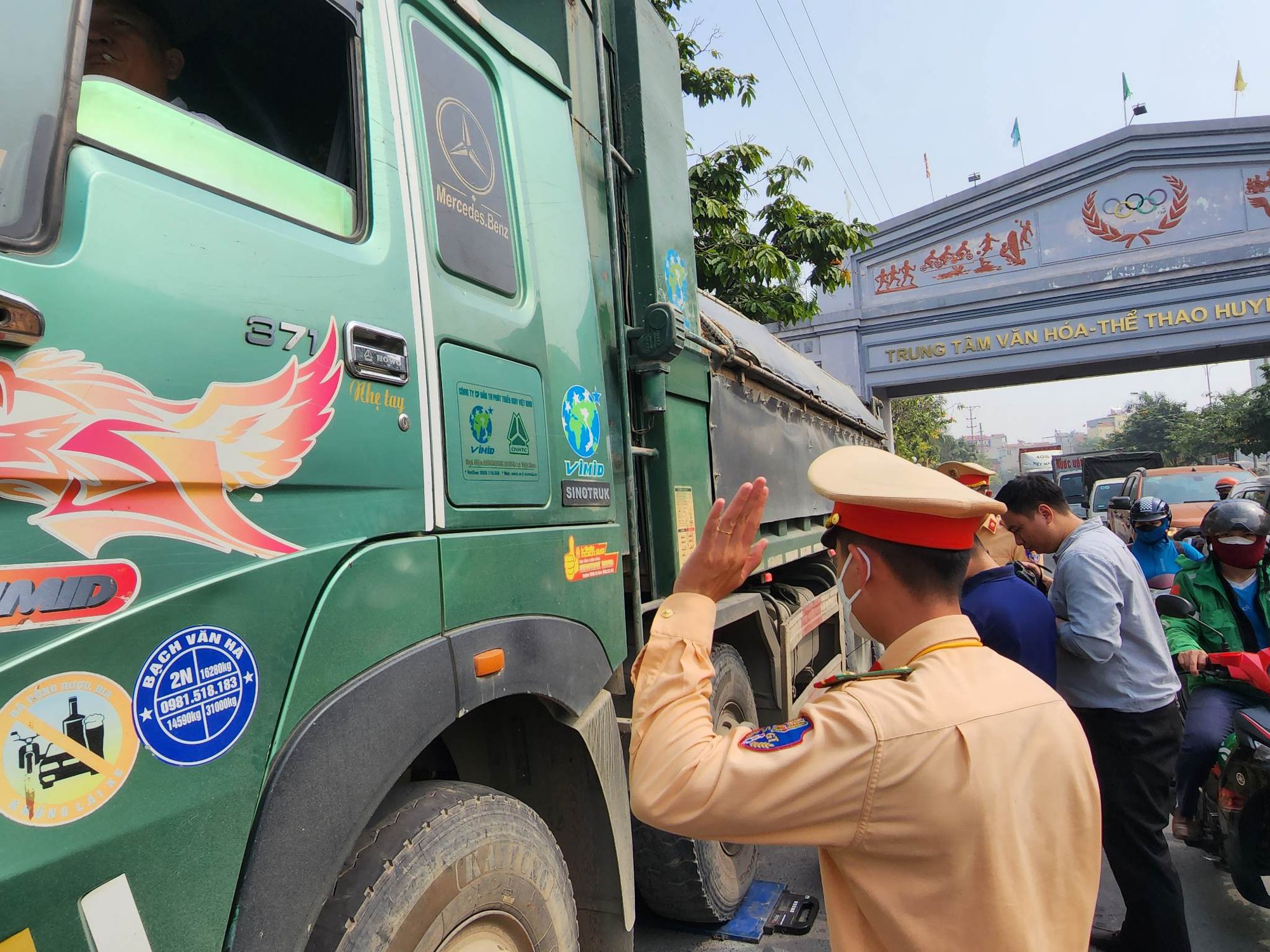 Chỉ sau vài phút, tổ công tác Đội CSGT đường bộ số 9 và Đội CSGT trật tự Công an huyện Đan Phượng có mặt tại đây đã tiến hành dừng kiểm tra xe tải "hổ vồ" mang BKS 29H-587.xx chở cát lưu thông trên QL32 hướng về huyện Hoài Đức (Hà Nội). Tổ công tác thông báo cho tài xế xe tải "hổ vồ" 29H-587.xx về chuyên đề kiểm tra cân trọng tải phương tiện, đồng thời yêu cầu tài xế xuất trình giấy tờ liên quan đến phương tiện và người lái. Tài xế điều khiển 29H-587.xx là anh Hoàng Quốc B. (sinh năm 1993, ở huyện Thọ Xuân, tỉnh Thanh Hoá) điều khiển. Kết quả, xe ô tô tải "hổ vồ" 29H-587.xx vi phạm chở quá tải từ 10 đến 30%. Sau đó, tài xế B. xin ra ngoài gọi điện thoại tìm "cứu viện" nhưng không được, đã quay lại kí vào biên bản vi phạm theo qui định.