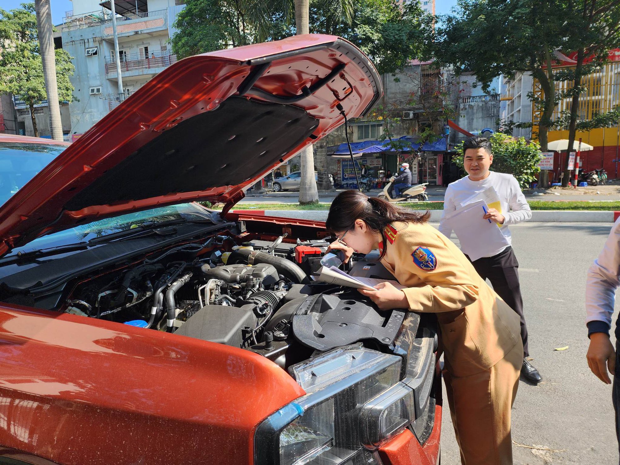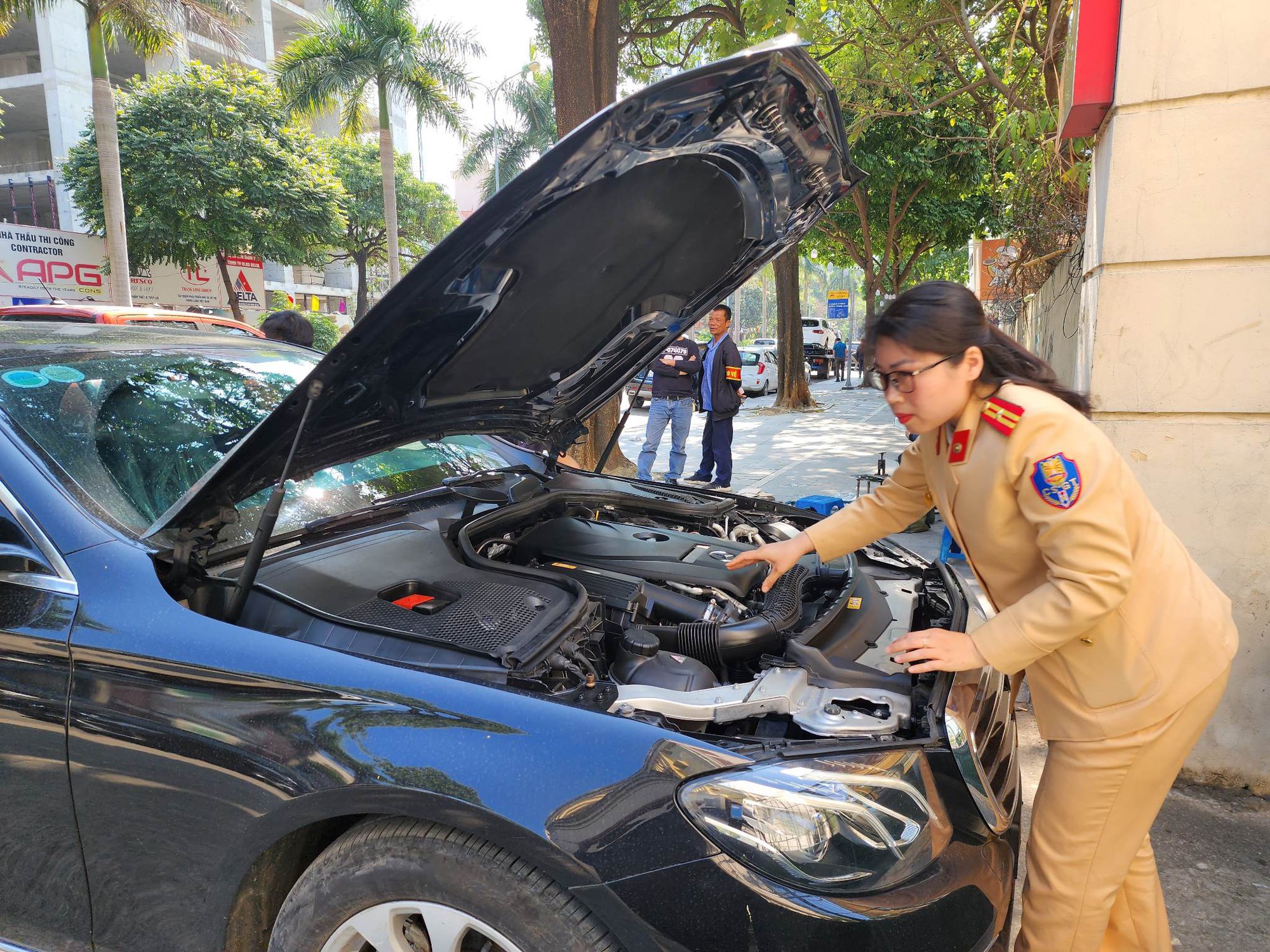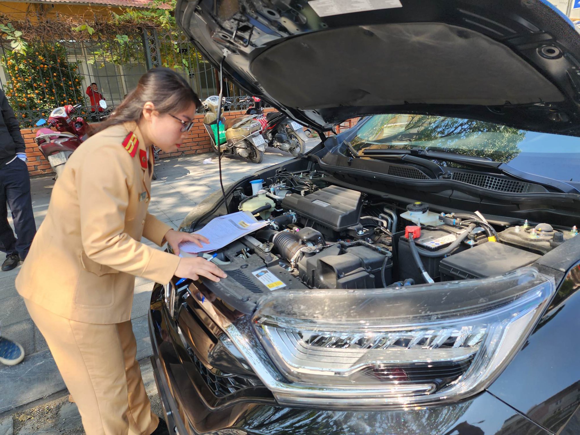 Cán bộ nữ CSGT cơ sở đăng kí xe số 3, Đội đăng kí, Phòng CSGT Công an TP Hà Nội kiểm tra số khung, số máy xe ô tô.