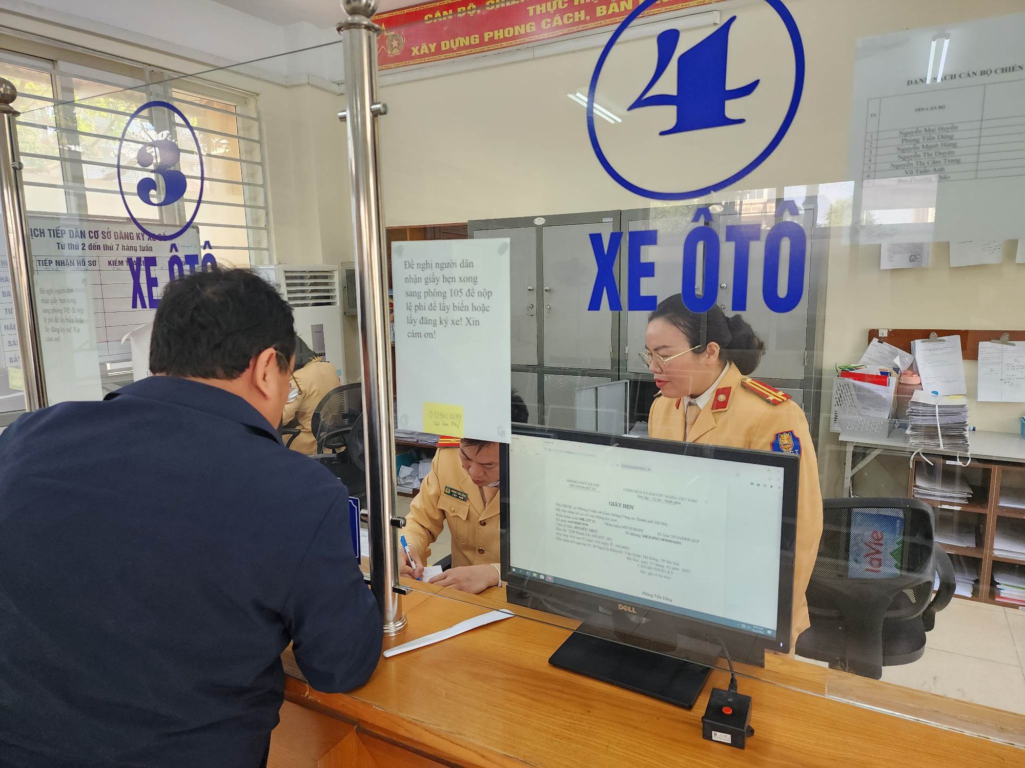 Thượng uý Nguyễn Thị Cẩm Trang, nữ cán bộ cơ sở đăng kí xe ô tô số 3, Đội đăng ký, Phòng CSGT Công an TP Hà Nội cho hay, giờ mọi thủ tục đăng kí xe ô tô đều đăng kí trên dịch vụ công Quốc gia. Đối với những chủ phương tiện chủ động đăng kí khai báo các thủ tục trên dịch vụ công Quốc gia ngay từ nhà, khi đến cơ sở đăng kí, CSGT tiếp nhận đủ thủ tục sẽ tiến hành bấm lấy biển số ngay và nhận giấy hẹn lấy đăng kí xe.