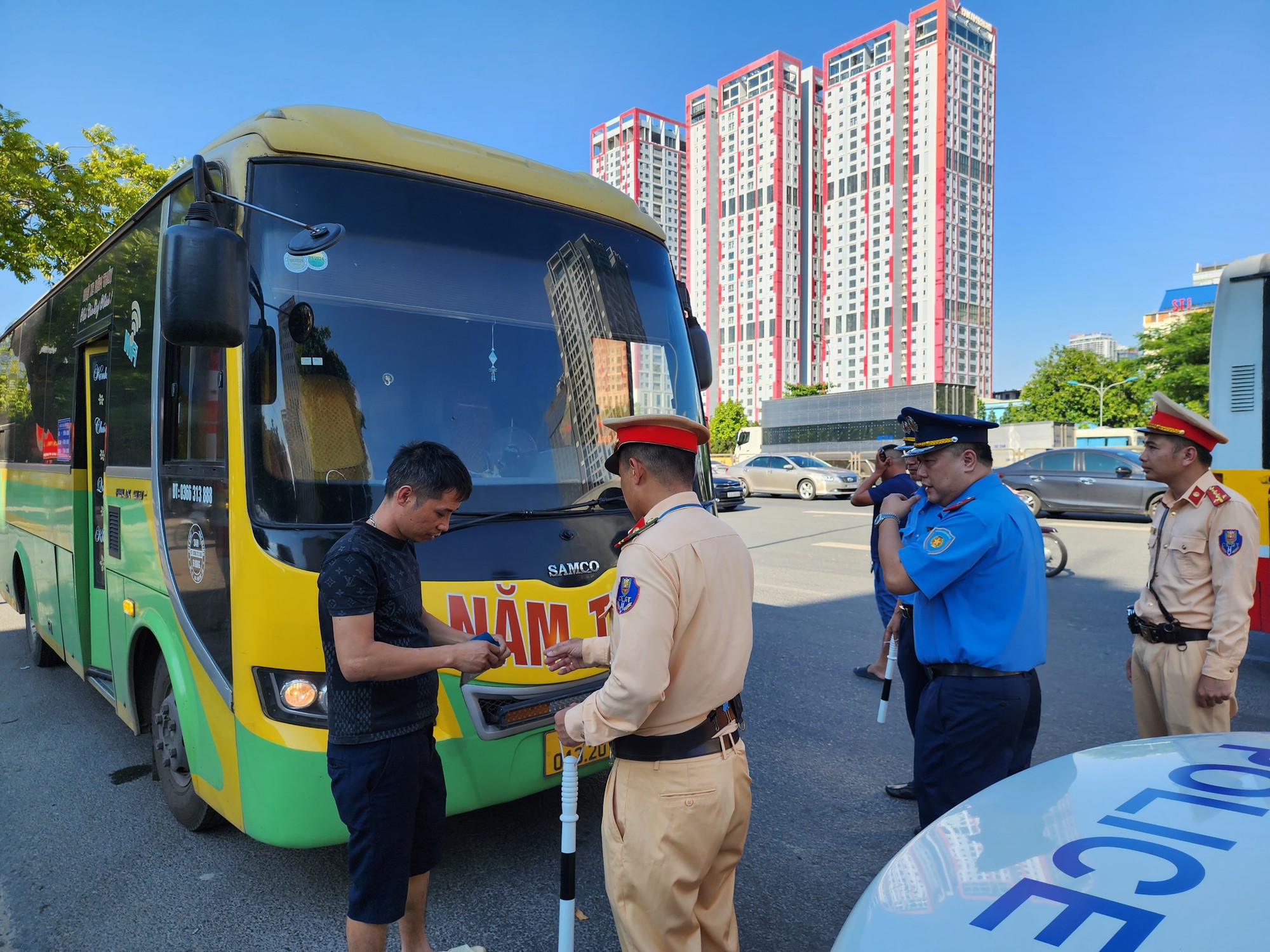 Liên ngành TTGT - CSGT Hà Nội phối hợp kiểm tra xử lý xe ôtô khách hợp đồng vi phạm trên đường Phạm Hùng chiều 31/8