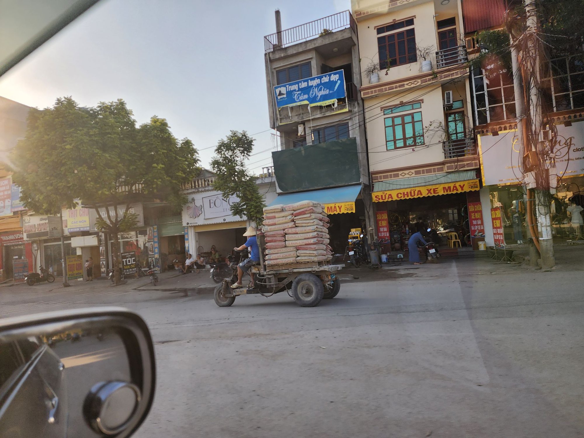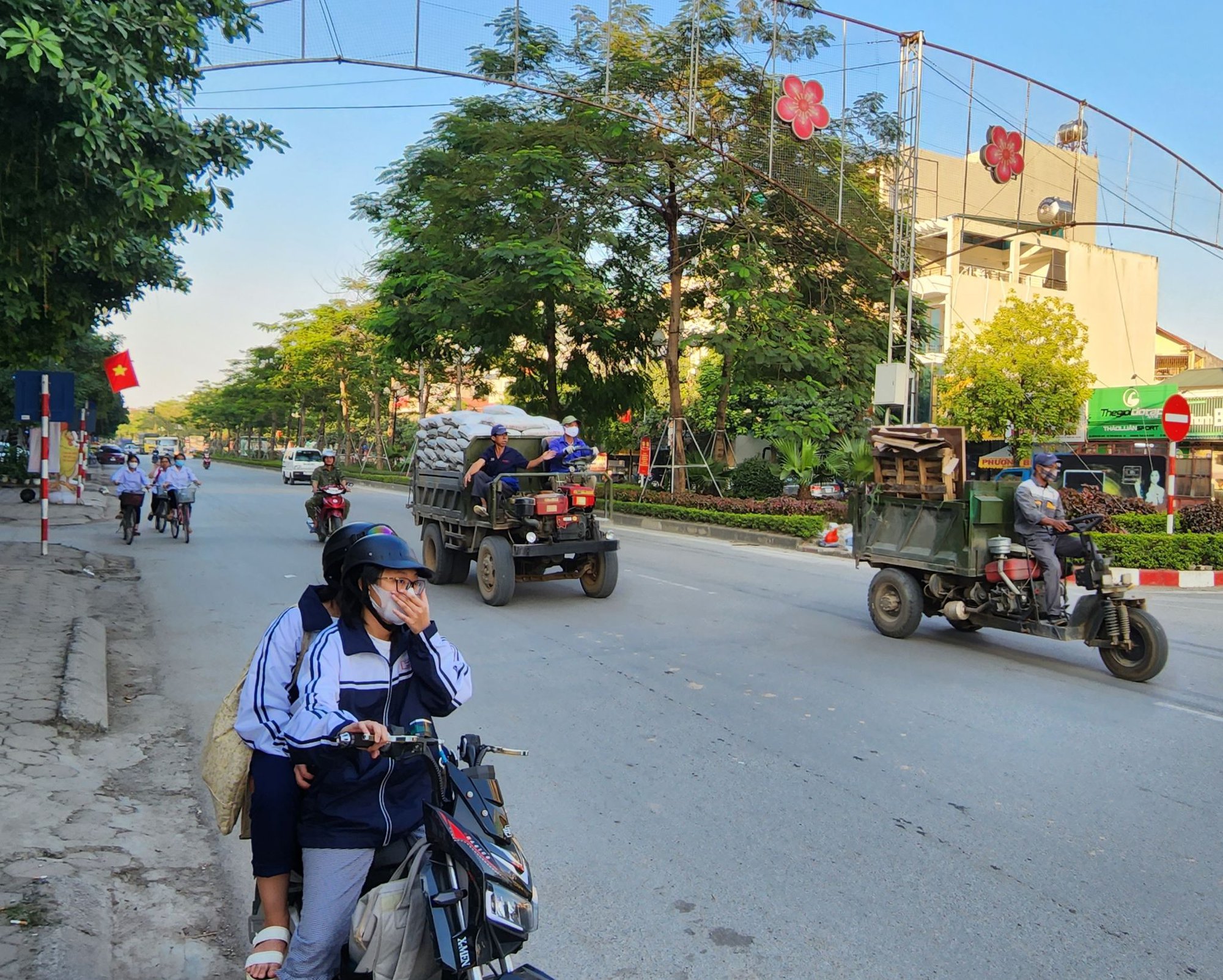 Hàng loạt xe tự chế, xe công nông đầu ngang chở vật liệu xây dựng lưu thông trên phố Phú Quốc - tuyến trung tâm huyện Quốc Oai (ảnh chụp ngày 11/10)