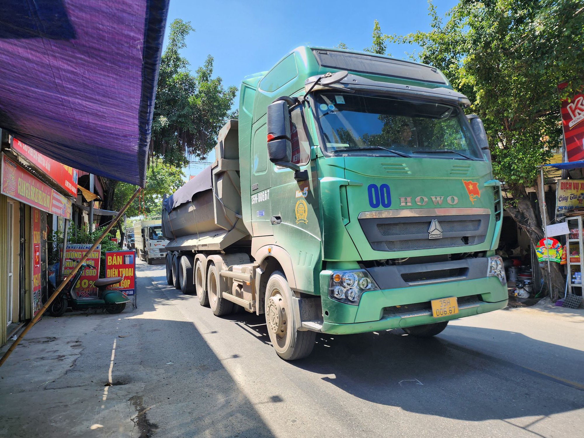 Video xe tải Howo chở vật liệu xây dựng nối đuôi nhau chạy qua trung tâm huyện Quốc Oai (phố Phú Quốc) ngày 12/10