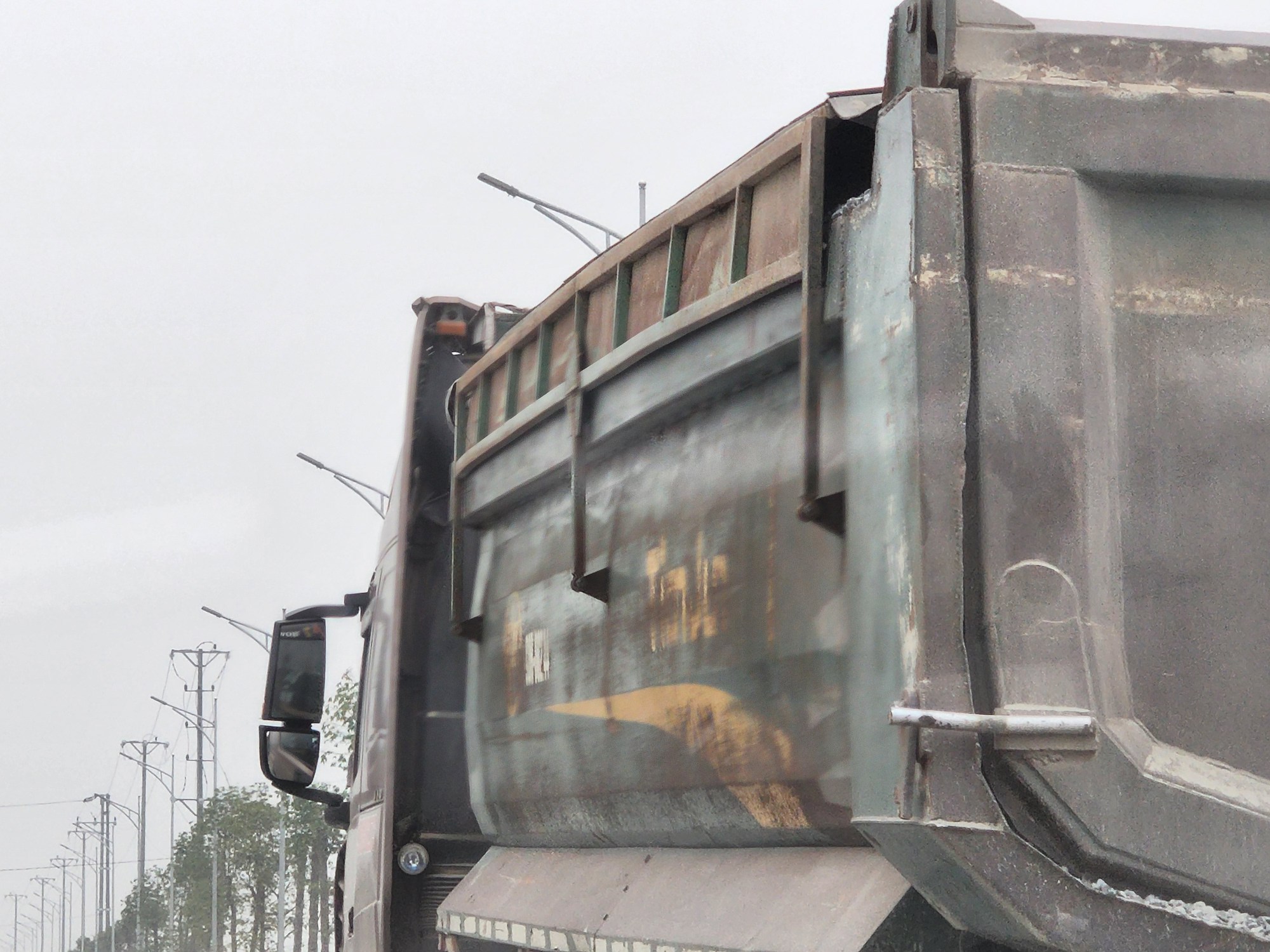 Một hình ảnh xe tải "hổ vồ" có dấu hiệu cơi nới thành thùng chở vật liệu xây dựng lưu thông trên địa bàn Thị xã Sơn Tây, Hà Nội.