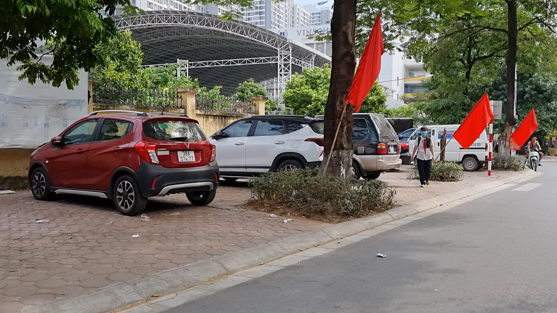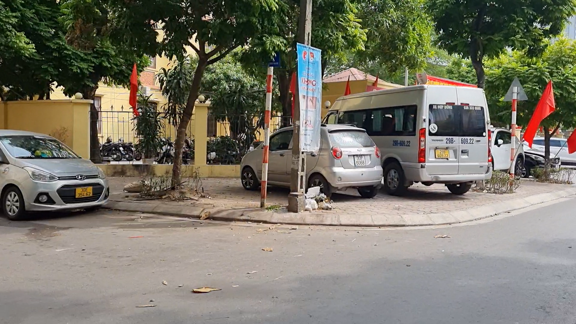 Vỉa hè trước cửa UBND phường Mai Động bị hàng chục xe ô tô bủa vây, người đi bộ chỉ còn cách đi dưới lòng đường