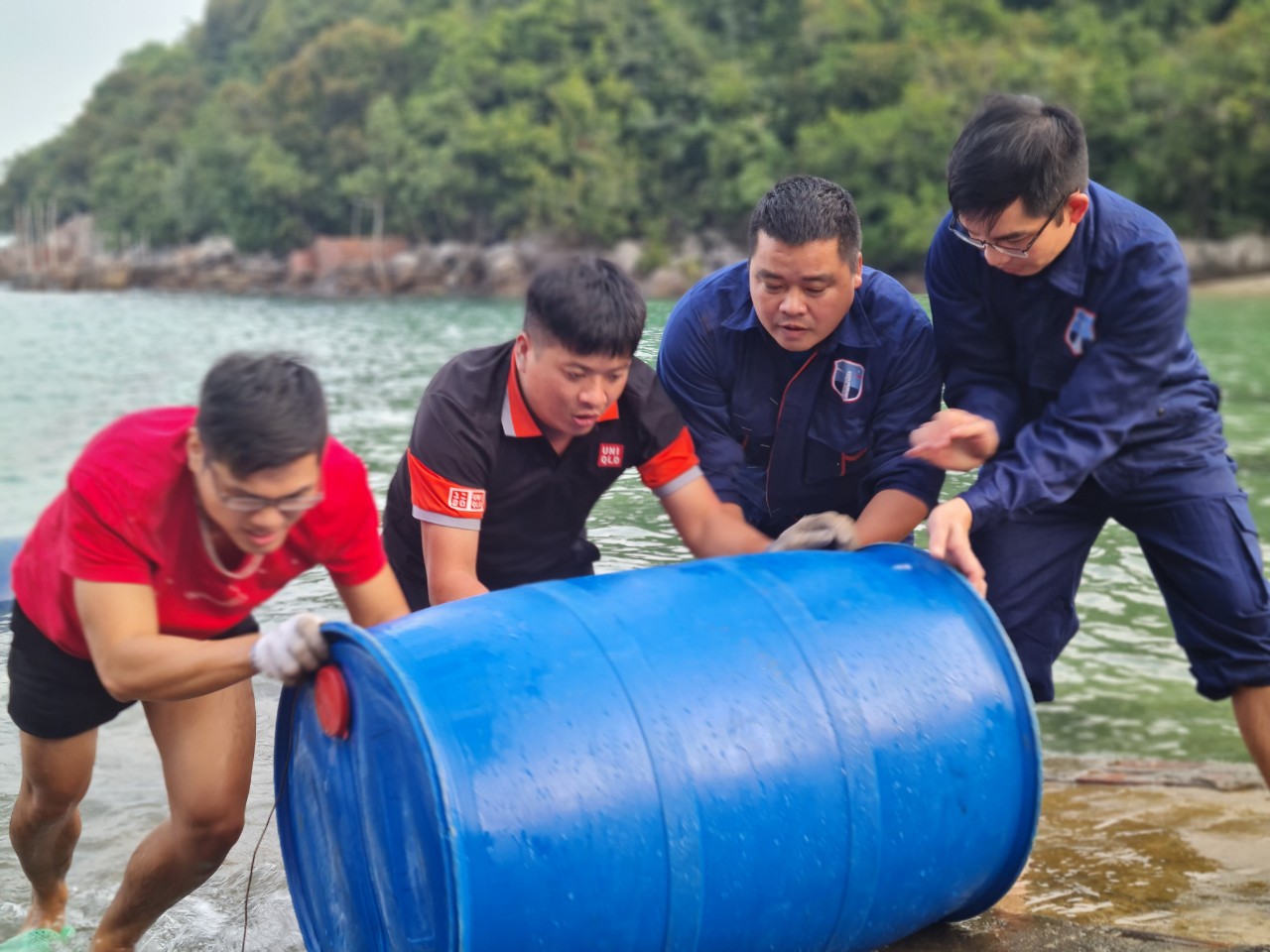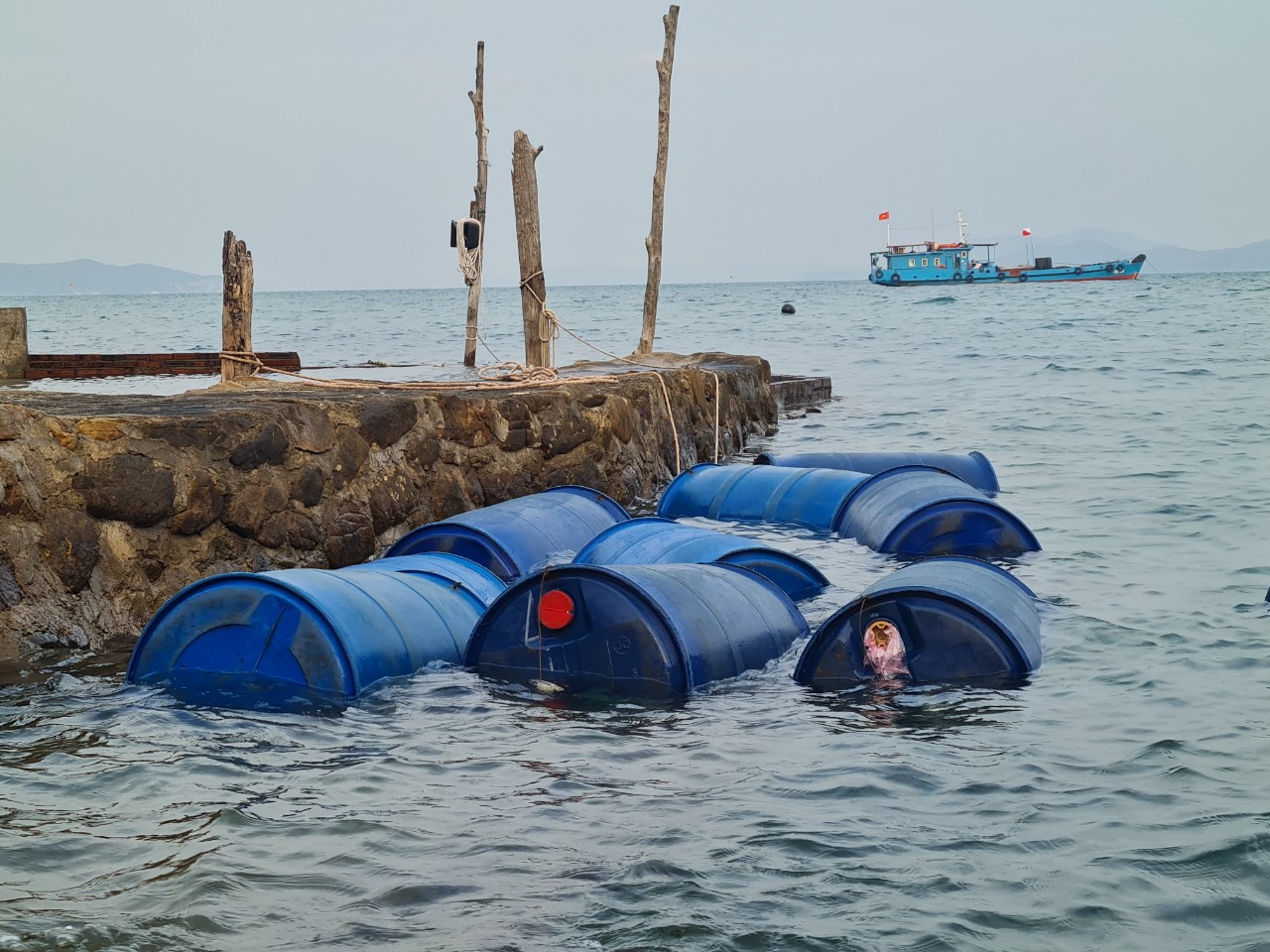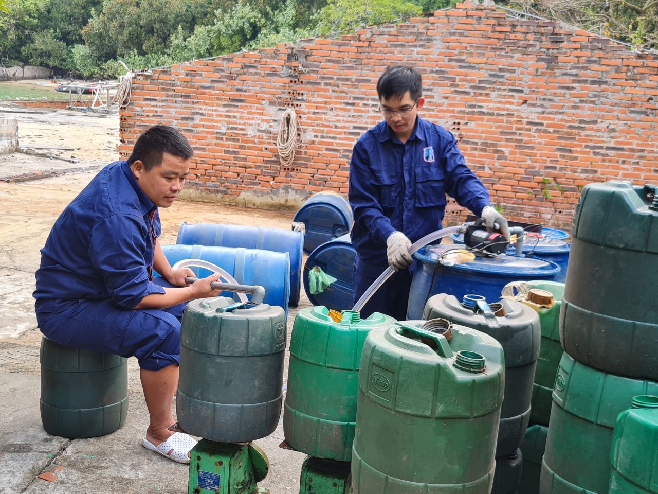 Những thùng phuy dầu diezel chuyển từ tàu tiếp tế, thả trôi trên biển rồi được anh em trạm hải đăng Hạ Mai đưa vào bờ, san ra các can 20 lít