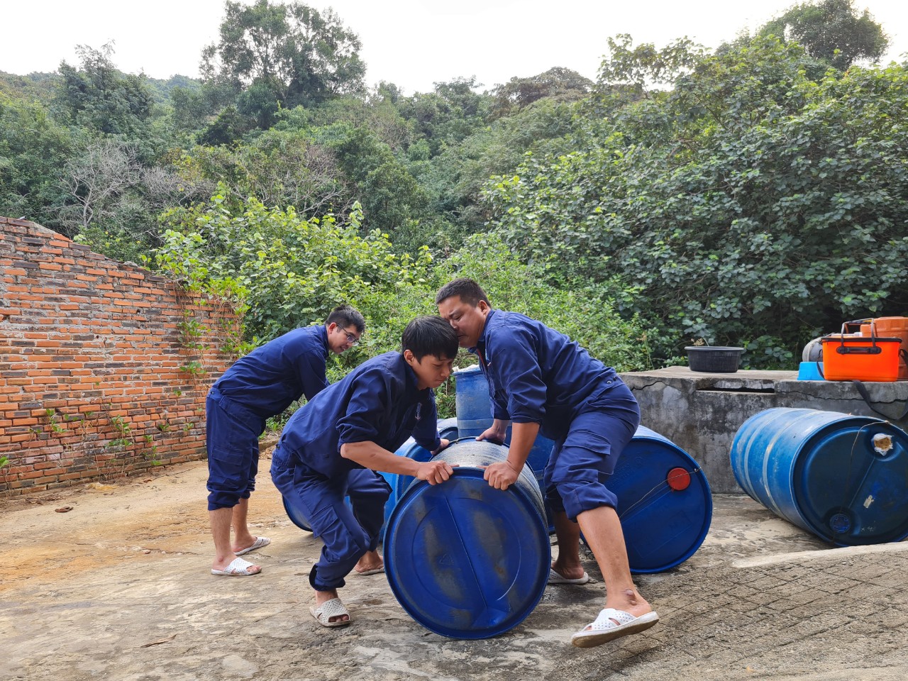 "Ngoài bể nước khoảng 36 khối dưới dưới lòng nhà, trạm còn được cấp 5 téc nước. Mùa mưa đỡ hơn, nhưng sang đến mùa khô, anh em phải dùng tiết kiệm nước. Thậm chí phải tận dụng nước sinh hoạt để tưới rau, cải thiện bữa ăn. Có thời điểm thiếu nước phải mua nước ngọt từ ngư dân với chi phí cao hơn, đổ vào bể dưới chân núi, sau đó san ra các can và lại gánh lên trạm", anh Tuyên chia sẻ.