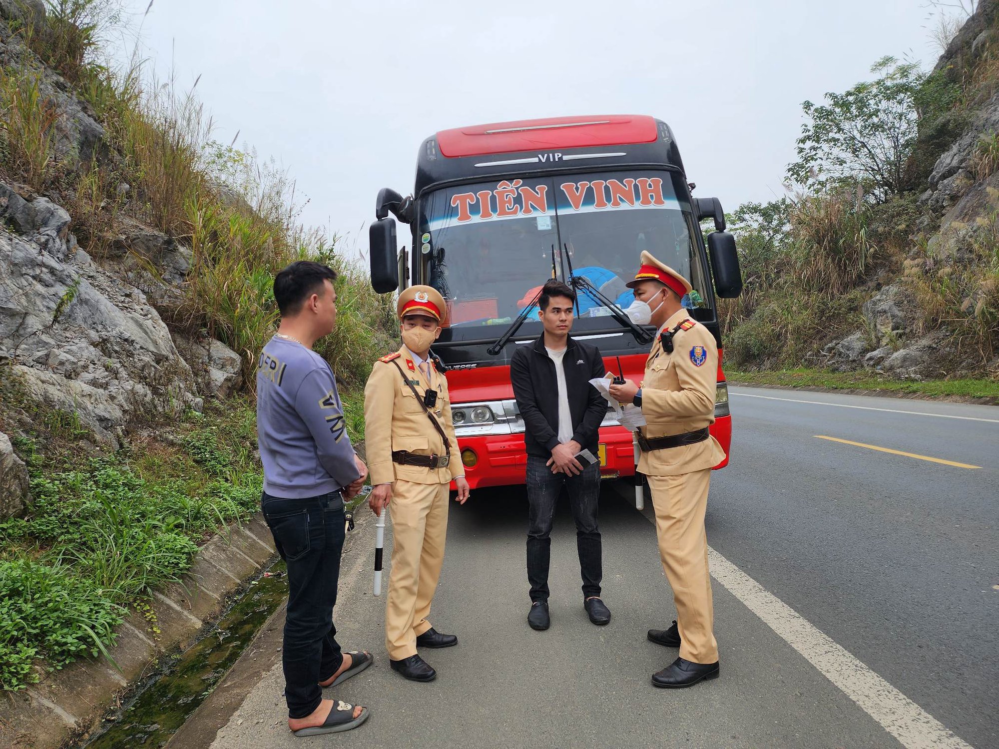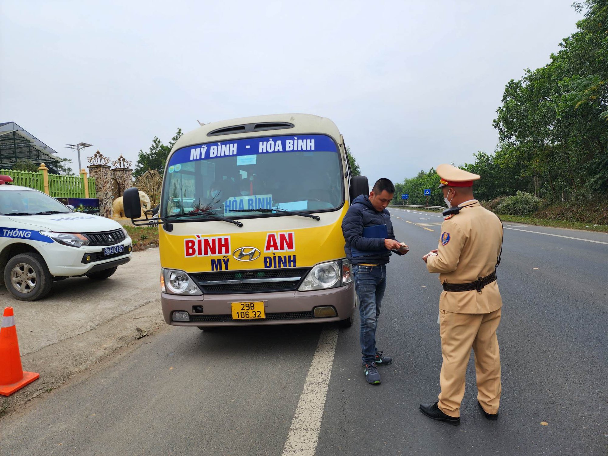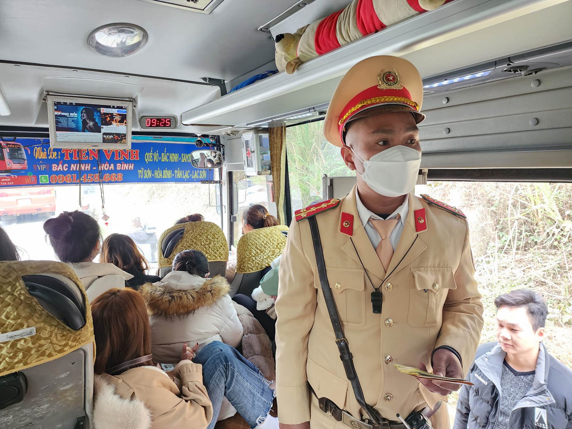 Ngay sau đó, tổ công tác tiến hành kiểm tra ô tô khách mang BKS 99F-000.xx của nhà xe Thế Vinh do lái xe Nông Văn T. (sinh năm 1990, ở phường Ngọc Xuân, TP Cao Bằng, tỉnh Cao Bằng) điều khiển chạy tuyến Bắc Ninh- Hoà Bình. Sau khi kiểm tra, CSGT thông báo hành vi vi phạm "Để hàng hoá trong khoang chở hành khách". Sau 1 hồi xin không được lái xe đã kí vào biên bản vi phạm.
