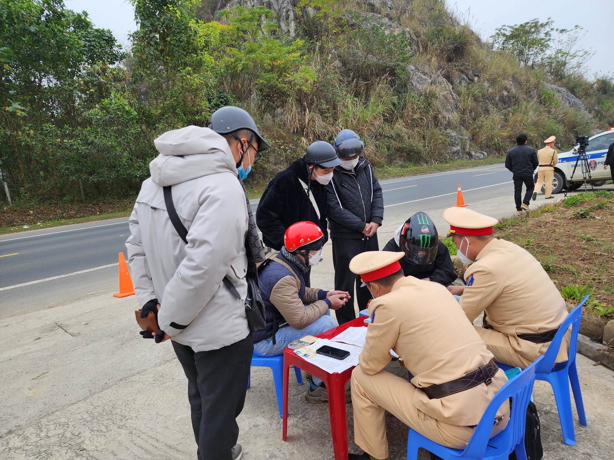 Tiếp đó, bộ đàm báo về trường hợp thanh niên điều khiển xe máy mang BKS 26B1- 720.xx vi phạm tốc độ 81/60km. Ngay sau khi dừng xe, tài xế điều khiển xe máy mang BKS 26B1- 720.xx là Quách Công N. (sinh năm 1992, ở Phiềng Khoai, huyện Yên Châu, tỉnh Sơn La) điều khiển. Ngay sau khi xuống xe, anh Quách Công N. trình bày, vội về quê xa không để ý, muốn CSGT bỏ qua vi phạm nhưng không được, anh N. đã kí vào biên bản vi phạm.