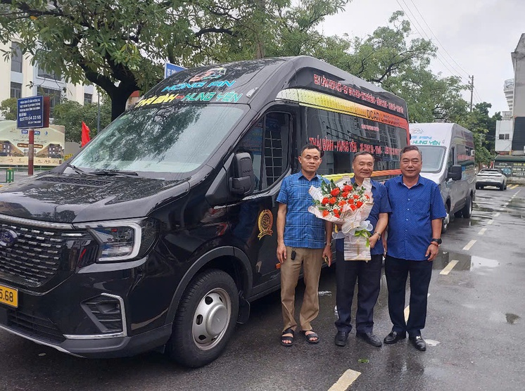 Ông Phan Thế Hùng - PGĐ Ban Quản lý bến xe, bến thủy Hưng Yên tặng hoa chúc mừng Công ty Cổ phần Xây dựng và Vận tải Sông Hồng đưa vào khai thác tuyến.