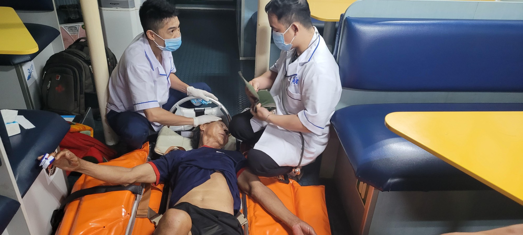 Bằng tốc độ hành trình nhanh nhất, lúc 1h15 ngày 31/10/2023, lực lượng cứu nạn hàng hải đã tiếp cận được tàu QNg 98308 TS, đội ngũ y bác sỹ cùng nhân viên cứu nạn lập tức được triển khai lên tàu QNg 98308 TS để thực hiện cấp cứu tại chỗ. Tình trạng bệnh nhân lúc này đã mất ý thức, liệt nửa người và lập tức được các y bác sỹ chuyên khoa thực hiện cấp cứu để ổn định tình trạng và chuyển lên tàu SAR 412 để được chăm sóc y tế chuyên khoa và khẩn trương đưa về đất liền điều trị. Dưới sự nỗ lực và tận tình cứu chữa của đội ngũ y bác sỹ và các nhân viên cứu nạn, bệnh nhân bước đầu đã vượt qua cơn nguy kịch, bảo toàn được tính mạng.