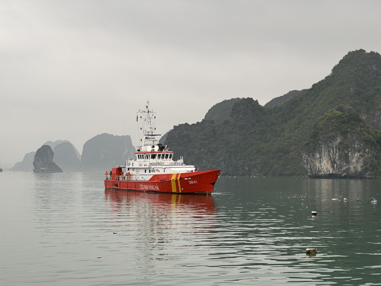 Hiện trường lực lượng chức năng phối hợp cứu nạn khu vực trực thăng rơi tại khu vực biển giáp ranh xã Gia Luận, huyện Cát Hải, thành phố Hải Phòng.