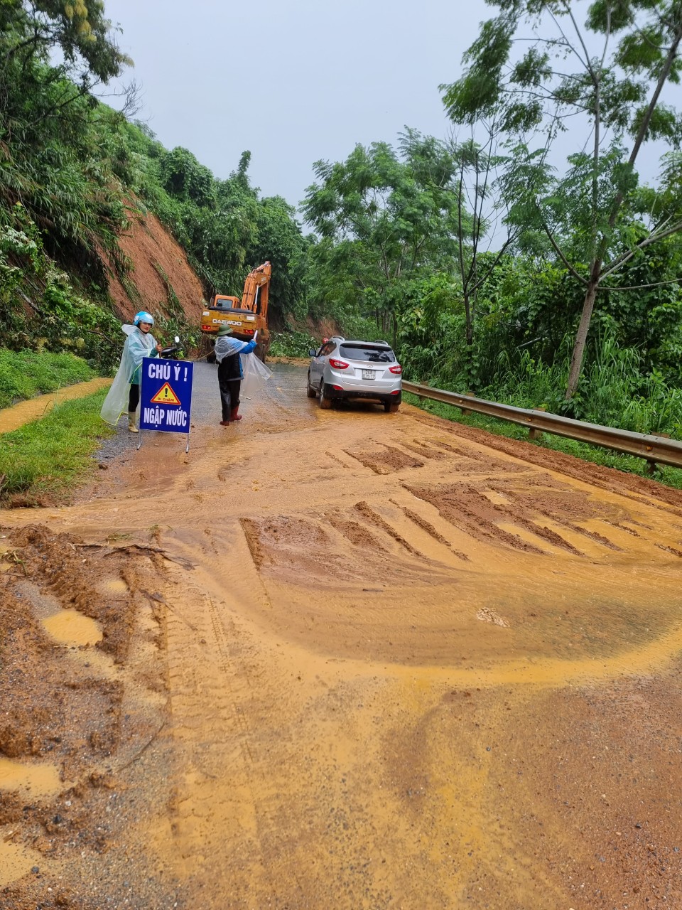 Lực lượng thuộc Văn phòng Quản lý đường bộ I.3 ứng trực, điều tiết giao thông tại điểm ngập trên QL70 qua huyện Bảo Thắng